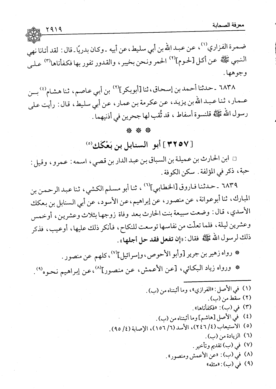 ٦٨٣٩ - حَدَّثَنَا فَارُوقٌ الْخَطَّابِيُّ، ثنا أَبُو مُسْلِمٍ الْكَشِّيُّ، ثنا عَبْدُ الرَّحْمَنِ بْنُ الْمُبَارَكِ، ثنا أَبُو عَوَانَةَ، عَنْ مَنْصُورٍ، عَنْ إِبْرَاهِيمَ، عَنِ الْأَسْوَدِ، عَنْ أَبِي السَّنَابِلِ بْنِ بَعْكَكٍ الْأَسَدِيِّ، قَالَ: " وَضَعَتْ سُبَيْعَةُ بِنْتُ الْحَارِثِ بَعْدَ وَفَاةِ زَوْجِهَا بِثَلَاثٍ وَعِشْرِينَ، أَوْ خَمْسٍ وَعِشْرِينَ لَيْلَةً، فَلَمَّا تَعَلَّتْ مِنْ نِفَاسِهَا تَوَسَّعَتْ لِلنِّكَاحِ، فَأُنْكِرَ ذَلِكَ عَلَيْهَا، أَوْ عِيبَ، فَذُكِرَ ذَلِكَ لِرَسُولِ اللهِ صَلَّى اللَّهُ عَلَيْهِ وَسَلَّمَ، فَقَالَ: «إِنْ تَفْعَلْ فَقَدْ حَلَّ أَجَلُهَا» رَوَاهُ زُهَيْرُ بْنُ جَرِيرٍ، وَأَبُو الْأَحْوَصِ، وَإِسْرَائِيلُ، كُلُّهُمْ، عَنْ مَنْصُورٍ وَرَوَاهُ زِيَادُ الْبَكَّائِيُّ، عَنِ الْأَعْمَشِ، عَنْ مَنْصُورٍ، عَنْ إِبْرَاهِيمَ نَحْوَهُ