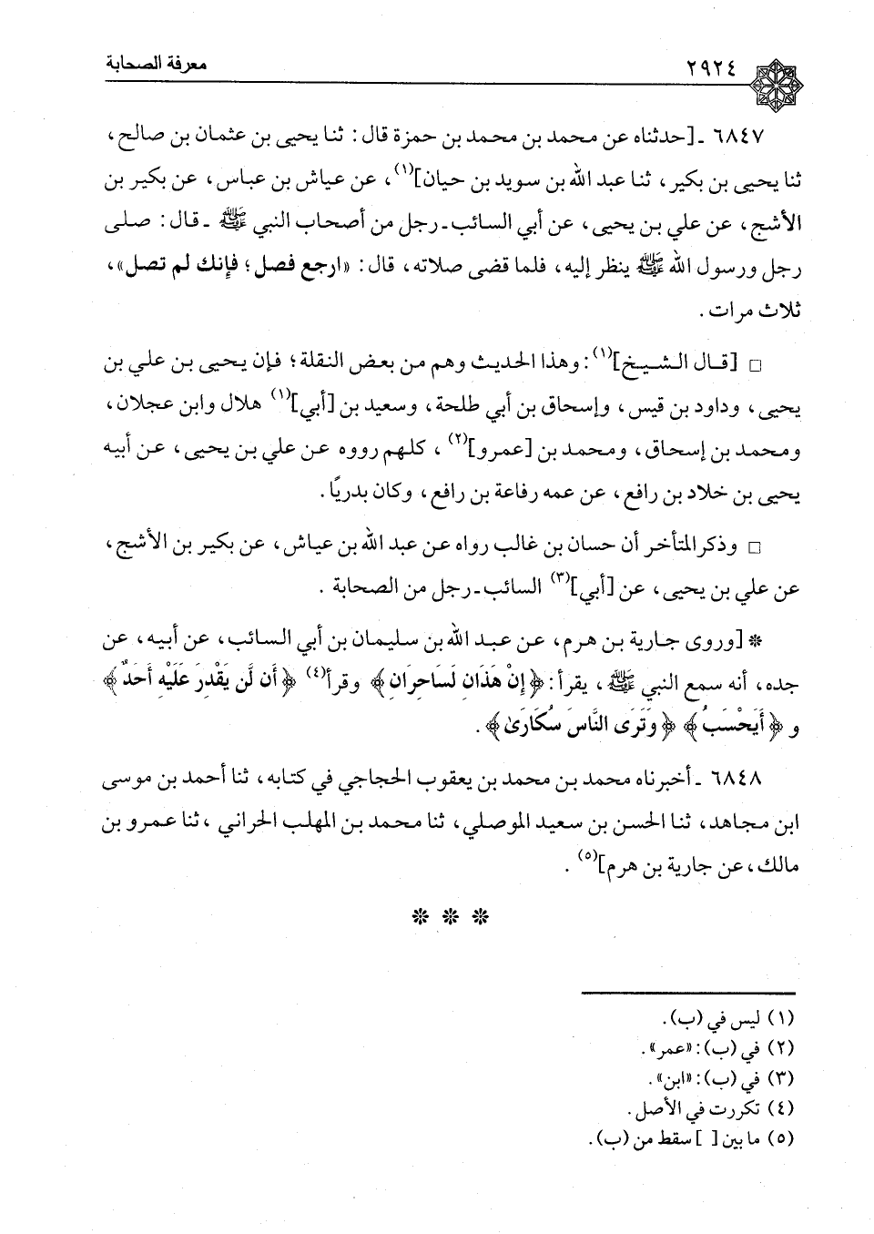 ٦٨٤٧ - حُدِّثْنَاهُ عَنْ مُحَمَّدِ بْنِ مُحَمَّدِ بْنِ حَمْزَةَ، قَالَ: ثنا يَحْيَى بْنُ عُثْمَانَ بْنِ صَالِحٍ، ثنا يَحْيَى بْنُ بُكَيْرٍ، ثنا عَبْدُ اللهِ بْنُ سُوَيْدِ بْنِ حَيَّانَ، عَنْ عَيَّاشِ بْنِ عَبَّاسٍ، عَنْ بُكَيْرِ بْنِ الْأَشَجِّ، عَنْ عَلِيِّ بْنِ يَحْيَى، عَنْ أَبِي السَّائِبِ، - رَجُلٌ مِنْ أَصْحَابِ النَّبِيِّ صَلَّى اللَّهُ عَلَيْهِ وَسَلَّمَ - قَالَ: " صَلَّى رَجُلٌ وَرَسُولُ اللهِ صَلَّى اللَّهُ عَلَيْهِ وَسَلَّمَ يَنْظُرُ إِلَيْهِ، فَلَمَّا قَضَى صَلَاتَهُ قَالَ: «ارْجِعْ فَصَلٍّ، فَإِنَّكَ لَمْ تُصَلِّ» ثَلَاثَ مَرَّاتٍ قَالَ الشَّيْخُ: وَهَذَا الْحَدِيثُ وَهْمٌ مِنْ بَعْضِ النَّقْلَةِ، فَإِنَّ يَحْيَى بْنَ عَلِيِّ بْنِ يَحْيَى، وَدَاوُدَ بْنَ قَيْسٍ، وَإِسْحَاقَ بْنَ أَبِي طَلْحَةَ، وَسَعِيدَ بْنَ أَبِي هِلَالٍ , وَابْنَ عَجْلَانَ، وَمُحَمَّدَ بْنَ إِسْحَاقَ، وَمُحَمَّدَ بْنَ عَمْرٍو، كُلُّهُمْ رَوَوْهُ عَنْ عَلِيِّ بْنِ يَحْيَى، عَنْ أَبِيهِ يَحْيَى بْنِ خَلَّادِ بْنِ رَافِعٍ، عَنْ عَمِّهِ رِفَاعَةَ بْنِ رَافِعٍ، وَكَانَ بَدْرِيًّا، وَذَكَرَ الْمُتَأَخِّرُ أَنَّ حَسَّانَ بْنَ غَالِبٍ رَوَاهُ، عَنْ عَبْدِ اللهِ بْنِ عَيَّاشٍ، عَنْ بُكَيْرِ بْنِ الْأَشَجِّ عَنْ عَلِيِّ بْنِ يَحْيَى عَنْ أَبِي السَّائِبِ - رَجُلٌ مِنَ الصَّحَابَةِ