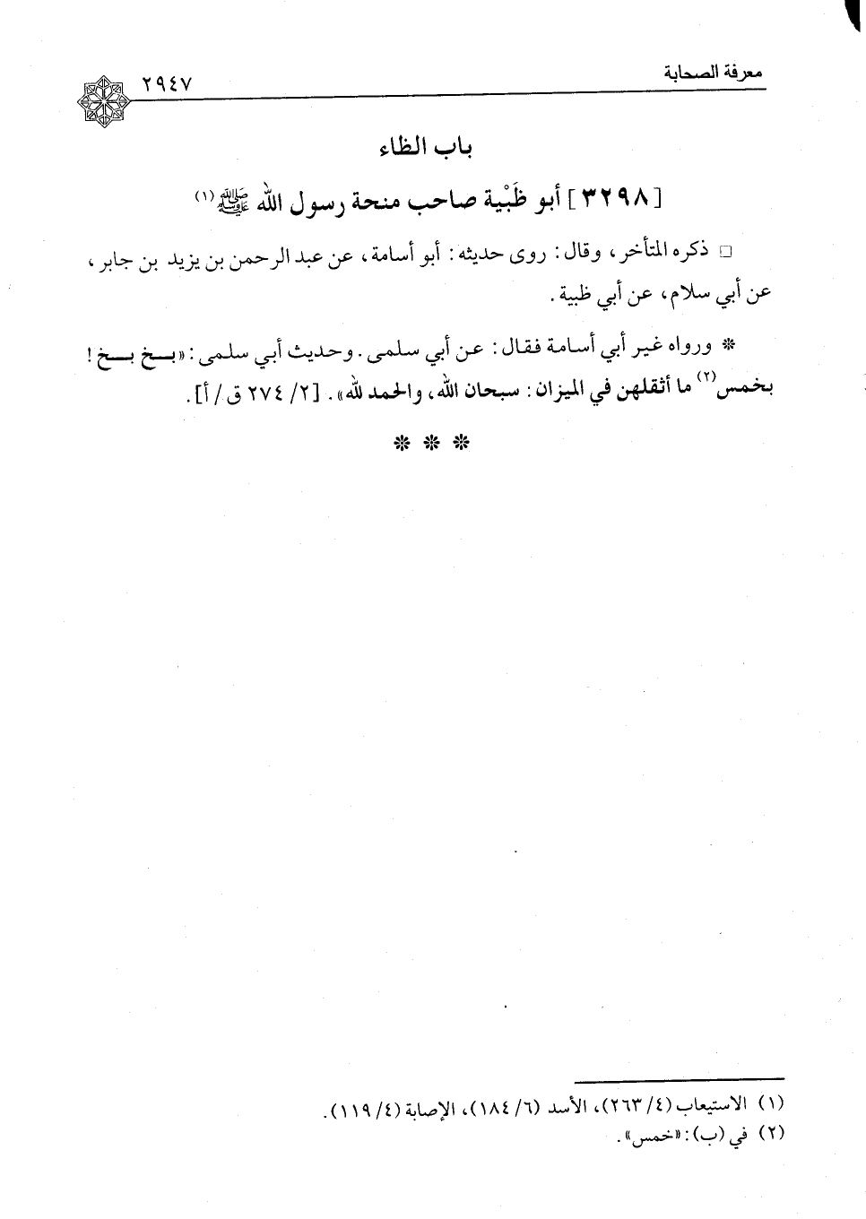 ذَكَرَهُ الْمُتَأَخِّرُ، وَقَالَ: رَوَىَ حَدِيثَهُ: أَبُو أُسَامَةَ، عَنْ عَبْدِ الرَّحْمَنِ بْنِ يَزِيدَ بْنِ جَابِرٍ، عَنْ أَبِي سَلَّامٍ، عَنْ أَبِي ظَبْيَةَ وَرَوَاهُ غَيْرُ أَبِي أُسَامَةَ فَقَالَ: عَنْ أَبِي سَلْمَى، وَحَدِيثُ أَبِي سَلْمَى: " بَخٍ بَخٍ بِخَمْسٍ مَا أَثْقَلَهُنَّ فِي الْمِيزَانِ: سُبْحَانَ اللهِ، وَالْحَمْدُ لِلَّهِ "