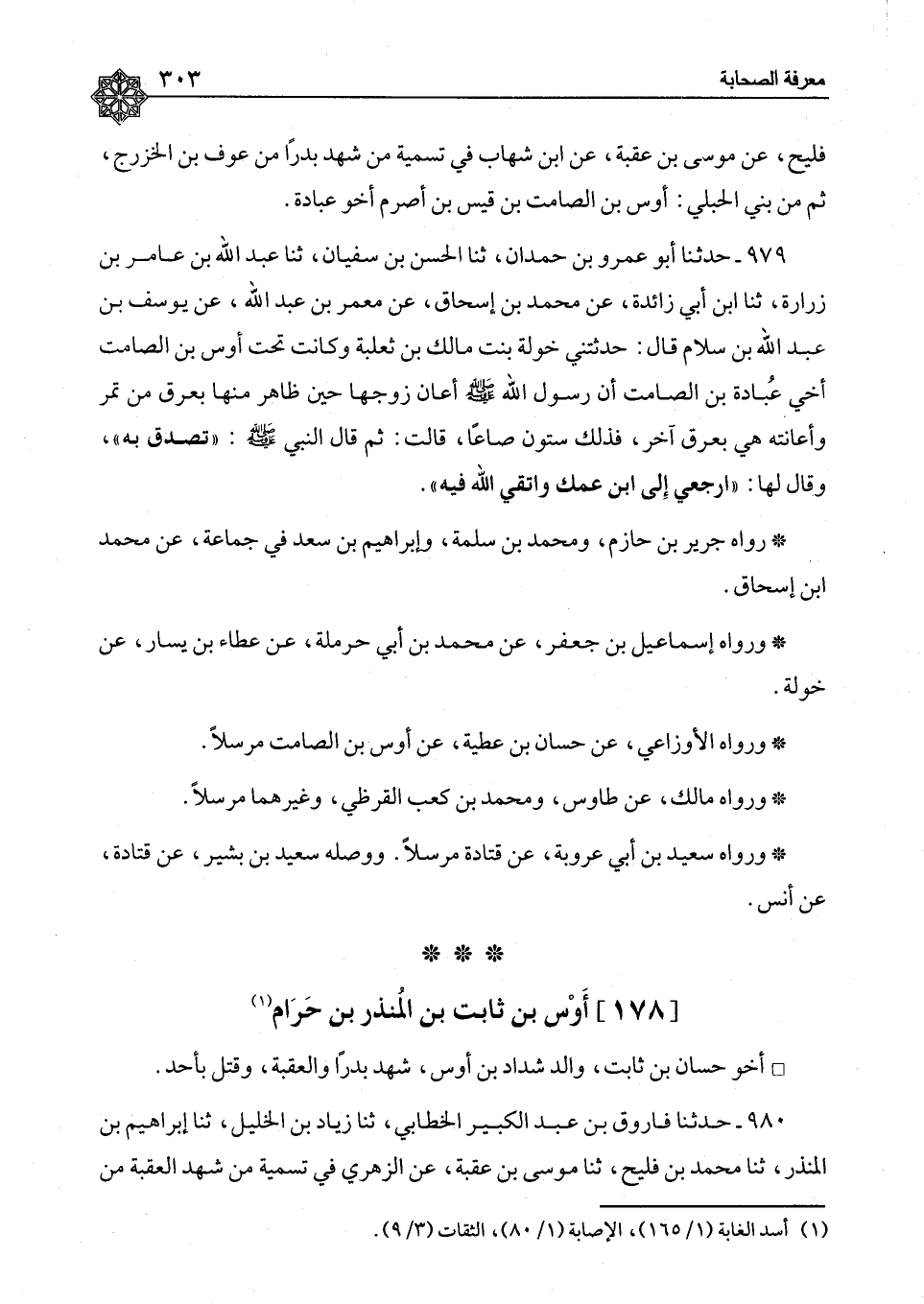 ٩٨٠ - حَدَّثَنَا فَارُوقُ بْنُ عَبْدِ الْكَبِيرِ الْخَطَّابِيُّ، ثنا زِيَادُ بْنُ الْخَلِيلِ، ثنا إِبْرَاهِيمُ بْنُ الْمُنْذِرِ، ثنا مُحَمَّدُ بْنُ فُلَيْحٍ، ثنا مُوسَى بْنُ عُقْبَةَ، عَنِ الزُّهْرِيِّ، " فِي تَسْمِيَةِ مَنْ شَهِدَ الْعَقَبَةَ مِنَ ⦗٣٠٤⦘ الْأَنْصَارِ مِنْ بَنِي النَّجَّارِ: أَوْسُ بْنُ ثَابِتٍ "