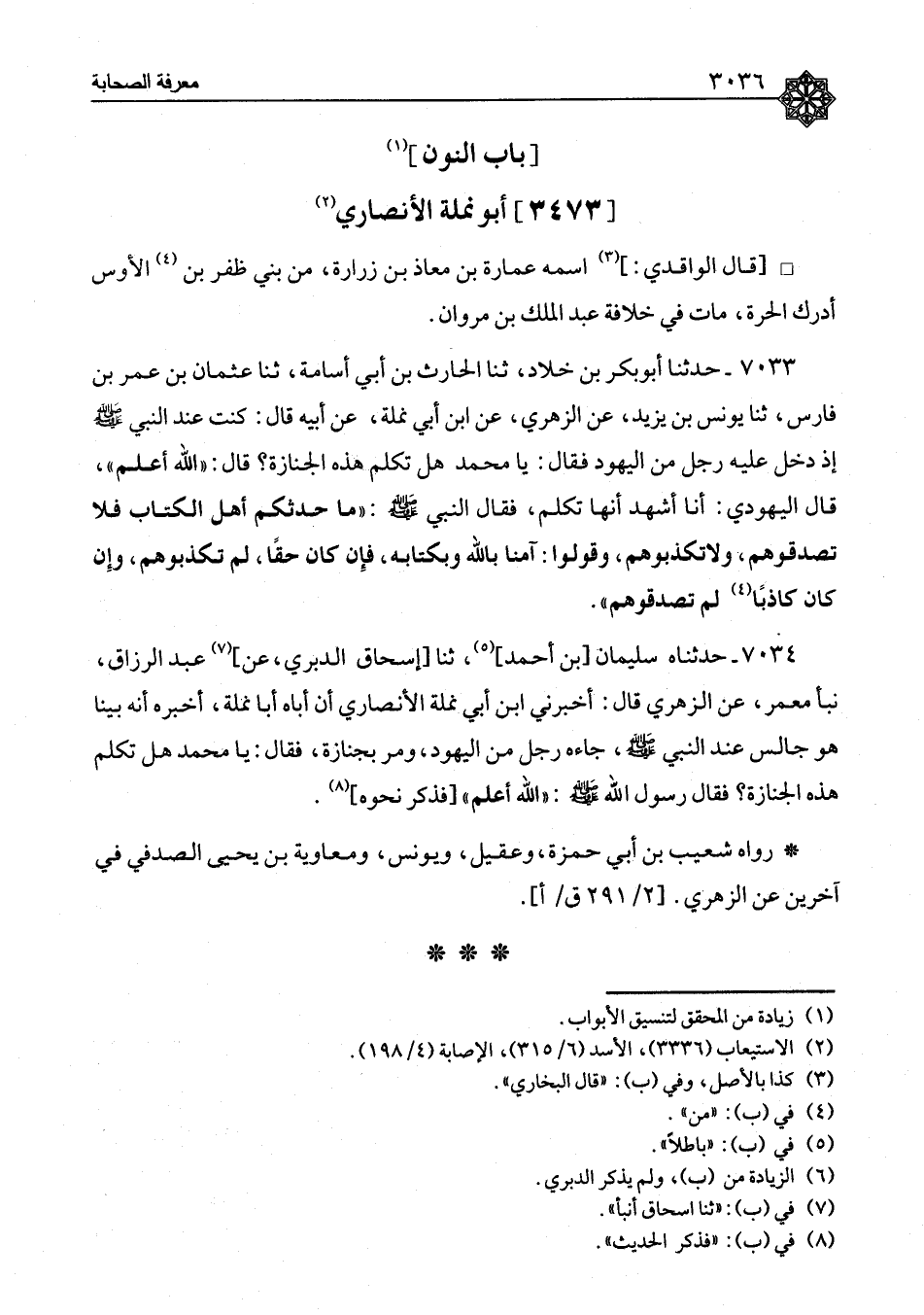 ٧٠٣٣ - حَدَّثَنَا أَبُو بَكْرِ بْنُ خَلَّادٍ، ثنا الْحَارِثُ بْنُ أَبِي أُسَامَةَ، ثنا عُثْمَانُ بْنُ عُمَرَ بْنِ فَارِسٍ، ثنا يُونُسُ بْنُ يَزِيدَ، عَنِ الزُّهْرِيِّ، عَنِ ابْنِ أَبِي نَمْلَةَ، عَنْ أَبِيهِ، قَالَ: كُنْتُ عِنْدَ النَّبِيِّ صَلَّى اللَّهُ عَلَيْهِ وَسَلَّمَ إِذْ دَخَلَ عَلَيْهِ رَجُلٌ مِنَ الْيَهُودِ، فَقَالَ: يَا مُحَمَّدُ، هَلْ تَكَلَّمُ هَذِهِ الْجَنَازَةُ؟ قَالَ: «اللهُ أَعْلَمُ» قَالَ الْيَهُودِيُّ: أَنَا أَشْهَدُ أَنَّهَا تَكَلَّمُ، فَقَالَ النَّبِيُّ صَلَّى اللَّهُ عَلَيْهِ وَسَلَّمَ: " مَا حَدَّثَكُمْ أَهْلُ الْكِتَابِ فَلَا تُصَدِّقُوهُمْ، وَلَا تُكَذِّبُوهُمْ، وَقُولُوا: آمَنَّا بِاللهِ وَبِكِتَابِهِ، فَإِنْ كَانَ حَقًّا، لَمْ تُكَذِّبُوهُمْ، وَإِنْ كَانَ كَاذِبًا، لَمْ تُصَدِّقُوهُمْ "