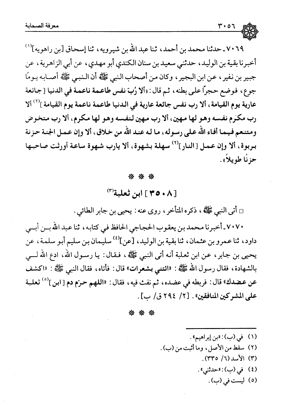 ٧٠٧٠ - أَخْبَرَنَا مُحَمَّدُ بْنُ يَعْقُوبَ الْحَجَّاجِيُّ الْحَافِظُ، فِي كِتَابِهِ، ثنا عَبْدُ اللهِ بْنُ أَبِي دَاوُدَ، ثنا عَمْرُو بْنُ عُثْمَانَ، ثنا بَقِيَّةُ بْنُ الْوَلِيدِ، عَنْ سُلَيْمَانَ بْنِ سُلَيْمٍ أَبُو سَلَمَةَ، عَنْ يَحْيَى بْنِ جَابِرٍ، عَنِ ابْنِ ثَعْلَبَةَ، أَنَّهُ أَتَى النَّبِيَّ صَلَّى اللَّهُ عَلَيْهِ وَسَلَّمَ، فَقَالَ: يَا رَسُولَ اللهِ، ادْعُ اللهَ لِي بِالشَّهَادَةِ، فَقَالَ رَسُولُ اللهِ صَلَّى اللَّهُ عَلَيْهِ وَسَلَّمَ: «ائْتِنِي بِشَعَرَاتٍ» قَالَ: فَأَتَاهُ، فَقَالَ النَّبِيُّ صَلَّى اللَّهُ عَلَيْهِ وَسَلَّمَ: «اكْشِفْ عَنْ عَضُدِكَ» قَالَ: فَرَبَطَهُ فِي عَضُدِهِ، ثُمَّ نَفَثَ فِيهِ، فَقَالَ: «اللهُمَّ حَرِّمْ دَمَ ابْنِ ثَعْلَبَةَ عَلَى الْمُشْرِكِينَ الْمُنَافِقِينَ»