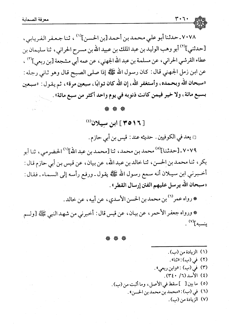 ٧٠٧٩ - حَدَّثَنَا مُحَمَّدُ بْنُ مُحَمَّدٍ، ثنا مُحَمَّدُ بْنُ عَبْدِ اللهِ الْحَضْرَمِيُّ، ثنا أَبُو بَكْرٍ، ثنا مُحَمَّدُ بْنُ الْحَسَنِ، ثنا خَالِدُ بْنُ عَبْدِ اللهِ، عَنْ بَيَانٍ، عَنْ قَيْسِ بْنِ أَبِي حَازِمٍ، قَالَ: أَخْبَرَنِي ابْنُ سِيلَانَ، أَنَّهُ سَمِعَ رَسُولَ اللهِ صَلَّى اللَّهُ عَلَيْهِ وَسَلَّمَ يَقُولُ، وَرَفَعَ رَأْسَهُ إِلَى السَّمَاءِ، فَقَالَ: «سُبْحَانَ اللهِ يُرْسِلُ عَلَيْهِمُ الْفِتَنَ إِرْسَالَ الْقَطْرِ» رَوَاهُ عُمَرُ بْنُ مُحَمَّدِ بْنِ الْحَسَنِ الْأَسَدِيُّ، عَنْ أَبِيهِ، عَنْ خَالِدٍ. وَرَوَاهُ جَعْفَرٌ الْأَحْمَرُ، عَنْ بَيَانٍ، عَنْ قَيْسٍ، قَالَ: أَخْبَرَنِي مَنْ شَهِدَ النَّبِيَّ صَلَّى اللَّهُ عَلَيْهِ وَسَلَّمَ، وَلَمْ يَنْسُبْهُ
