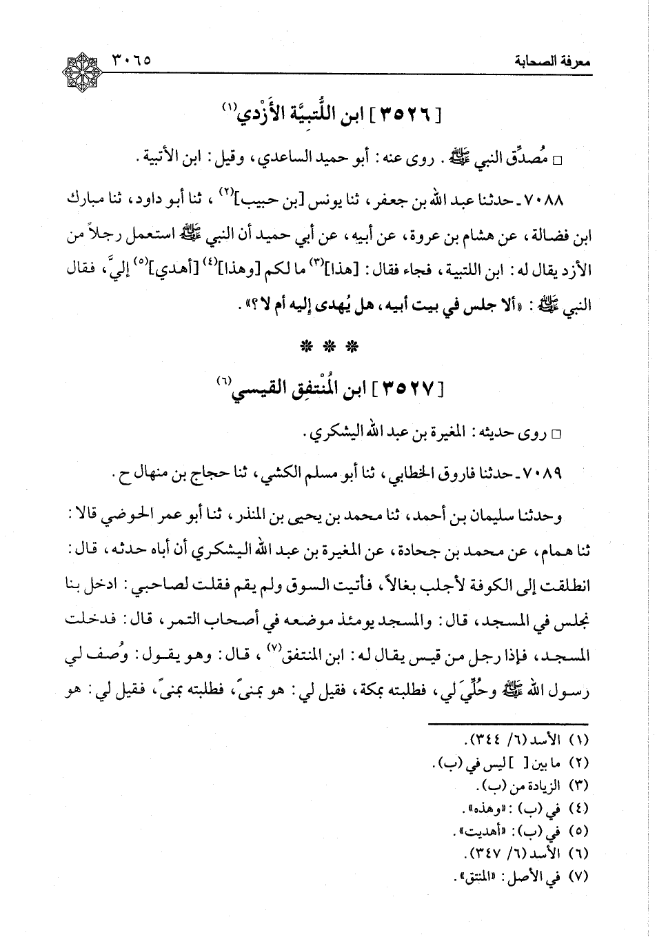 ٧٠٨٩ - حَدَّثَنَا فَارُوقٌ الْخَطَّابِيُّ، ثنا أَبُو مُسْلِمٍ الْكَشِّيُّ، ثنا حَجَّاجُ بْنُ الْمِنْهَالِ، ح وَحَدَّثَنَا سُلَيْمَانُ بْنُ أَحْمَدَ، ثنا مُحَمَّدُ بْنُ يَحْيَى بْنِ الْمُنْذِرِ، ثنا أَبُو عُمَرَ الْحَوْضِيُّ، قَالَا: ثنا هَمَّامٌ، عَنْ مُحَمَّدِ بْنِ جُحَادَةَ، عَنِ الْمُغِيرَةِ بْنِ عَبْدِ اللهِ الْيَشْكُرِيِّ، أَنَّ أَبَاهُ حَدَّثَهُ، قَالَ: انْطَلَقْتُ إِلَى الْكُوفَةِ لِأَجْلِبَ بِغَالًا، فَأَتَيْتُ السُّوقَ، وَلَمْ يُقَمْ، فَقُلْتُ لِصَاحِبِي: ادْخُلْ بِنَا نَجْلِسْ فِي الْمَسْجِدِ، قَالَ: وَالْمَسْجِدُ يَوْمَئِذٍ مَوْضِعُهُ فِي أَصْحَابِ التَّمْرِ، قَالَ: فَدَخَلْتُ الْمَسْجِدَ، فَإِذَا رَجُلٌ مِنْ قَيْسٍ يُقَالُ لَهُ: ابْنُ الْمُنْتَفِقِ، قَالَ: وَهُوَ يَقُولُ: وُصِفَ لِي رَسُولُ اللهِ صَلَّى اللَّهُ عَلَيْهِ وَسَلَّمَ وَحُلِّيَ لِي، فَطَلَبْتُهُ بِمَكَّةَ، فَقِيلَ لِي: هُوَ بِمِنًى، فَطَلَبْتُهُ بِمِنًى، فَقِيلَ لِي: هُوَ ⦗٣٠٦٦⦘ بِعَرَفَاتٍ، فَانْطَلَقْتُ إِلَيْهِ، فَزَاحَمْتُ عَلَيْهِ، قِيلَ لِي: إِلَيْكَ عَنْ طَرِيقِ رَسُولِ اللهِ صَلَّى اللَّهُ عَلَيْهِ وَسَلَّمَ، قَالَ: فَقَالَ رَسُولُ اللهِ صَلَّى اللَّهُ عَلَيْهِ وَسَلَّمَ: «دَعِ الرَّجُلَ أَرِبَ مَا لَهُ؟» قَالَ: فَزَاحَمْتُهُمْ عَلَيْهِ حَتَّى خَلَصْتُ إِلَيْهِ، قَالَ: فَأَخَذْتُ بِخِطَامِ رَاحِلَةِ رَسُولِ اللهِ صَلَّى اللَّهُ عَلَيْهِ وَسَلَّمَ، أَوْ بِزِمَامِهَا. . . " الْحَدِيثُ رَوَاهُ مُعَاذٌ، وَالنَّضْرُ بْنُ شُمَيْلٍ، عَنِ ابْنِ عَوْنٍ، عَنْ مُحَمَّدِ بْنِ جُحَادَةَ، عَنْ رَجُلٍ، عَنْ زَمِيلٍ لَهُ مِنْ بَنِي غُبَرَ، عَنْ أَبِيهِ، وَيُكْنَى: أَبَا الْمُنْتَفِقِ وَرَوَاهُ عَنِ الْمُغِيرَةِ: أَبُو إِسْحَاقَ السَّبِيعِيُّ، وَأَبُو إِسْحَاقَ الشَّيْبَانِيُّ، وَزُبَيْدٌ، وَعَاصِمُ بْنُ كُلَيْبٍ، وَيُونُسُ بْنُ أَبِي إِسْحَاقَ، وَعَمْرُو بْنُ حَسَّانَ، وَمُعَاوِيَةُ بْنُ سَلَمَةَ النَّصْرِيُّ، وَعَبْدُ رَبِّهِ بْنُ سَعِيدٍ الْأَنْصَارِيُّ