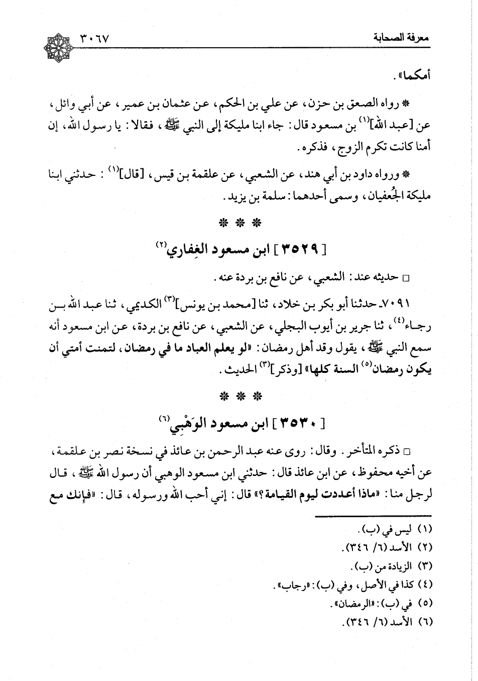 وَقَالَ: رَوَى عَنْهُ عَبْدُ الرَّحْمَنِ بْنُ عَائِذٍ فِي نُسْخَةِ نَصْرِ بْنِ عَلْقَمَةَ، عَنْ أَخِيهِ مَحْفُوظٍ، عَنِ ابْنِ عَائِذٍ، قَالَ: حَدَّثَنِي ابْنُ مَسْعُودٍ الْوَهْبِيُّ، أَنَّ رَسُولَ اللهِ صَلَّى اللَّهُ عَلَيْهِ وَسَلَّمَ، قَالَ لِرَجُلٍ مِنَّا: «مَاذَا أَعْدَدْتَ لِيَوْمِ الْقِيَامَةِ؟» قَالَ: إِنِّي أُحِبُّ اللهَ وَرَسُولَهُ، قَالَ: «فَإِنَّكَ مَعَ ⦗٣٠٦٨⦘ مَنْ أَحْبَبْتِ»