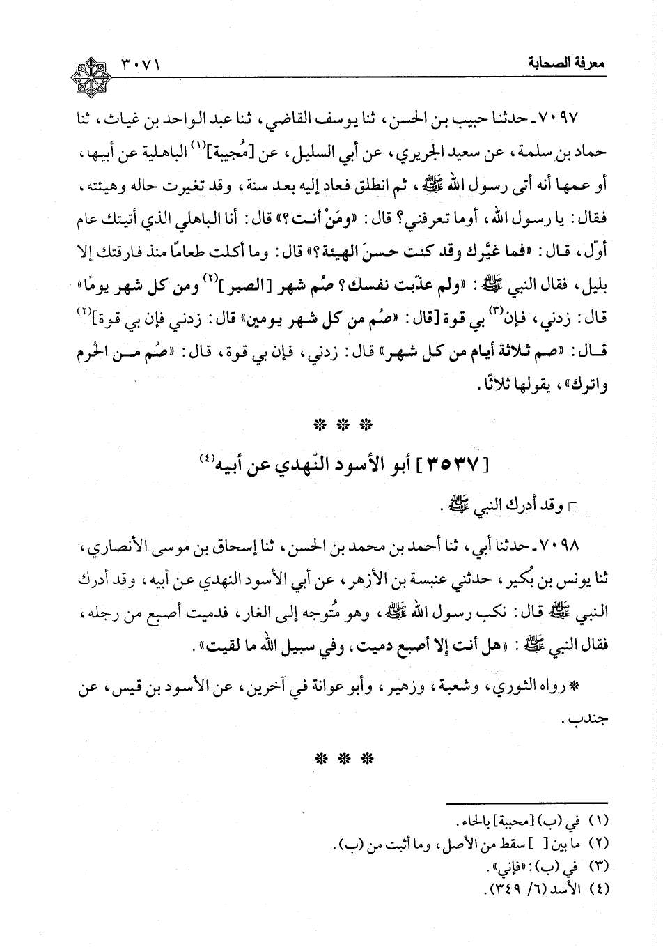 ٧٠٩٧ - حَدَّثَنَا حَبِيبُ بْنُ الْحَسَنِ، ثنا يُوسُفُ الْقَاضِي، ثنا عَبْدُ الْوَاحِدِ بْنُ غِيَاثٍ، ثنا حَمَّادُ بْنُ سَلَمَةَ، عَنْ سَعِيدٍ الْجُرَيْرِيِّ، عَنْ أَبِي السَّلِيلِ، عَنْ مُجِيبَةَ الْبَاهِلِيَّةِ، عَنْ أَبِيهَا، أَوْ عَمِّهَا، أَنَّهُ أَتَى رَسُولَ اللهِ صَلَّى اللَّهُ عَلَيْهِ وَسَلَّمَ، ثُمَّ انْطَلَقَ فَعَادَ إِلَيْهِ بَعْدَ سَنَةٍ، وَقَدْ تَغَيَّرَتْ حَالُهُ وَهَيْئَتُهُ، فَقَالَ: يَا رَسُولَ اللهِ، أَوَ مَا تَعْرِفُنِي؟ قَالَ: «وَمَنْ أَنْتَ؟» قَالَ: أَنَا الْبَاهِلِيُّ الَّذِي أَتَيْتُكَ عَامَ أَوَّلَ، قَالَ: «فَمَا غَيَّرَكَ، وَقَدْ كُنْتَ حَسَنَ الْهَيْئَةِ؟» قَالَ: وَمَا أَكَلْتُ طَعَامًا مُنْذُ فَارَقْتُكَ إِلَّا بِلَيْلٍ، فَقَالَ النَّبِيُّ صَلَّى اللَّهُ عَلَيْهِ وَسَلَّمَ: «وَلِمَ عَذَّبْتَ نَفْسَكَ؟» صُمْ شَهْرَ الصَّبْرِ، وَمِنْ كُلِّ شَهْرٍ يَوْمًا " قَالَ: زِدْنِي، فَإِنَّ بِي قُوَّةً، قَالَ: «صُمْ مِنْ كُلِّ شَهْرٍ يَوْمَيْنِ» قَالَ: زِدْنِي، فَإِنَّ بِي قُوَّةً، قَالَ: «صُمْ ثَلَاثَةَ أَيَّامٍ مِنْ كُلِّ شَهْرٍ» قَالَ: زِدْنِي، فَإِنَّ بِي قُوَّةً، قَالَ: «صُمْ مِنَ الْحُرُمِ وَاتْرُكْ» يَقُولُهَا ثَلَاثًا