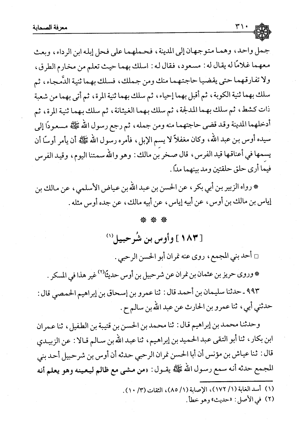 ٩٩٣ - حَدَّثَنَا سُلَيْمَانُ بْنُ أَحْمَدَ، قَالَ: ثنا عَمْرُو بْنُ إِسْحَاقَ بْنِ إِبْرَاهِيمَ الْحِمْصِيُّ، قَالَ: حَدَّثَنِي أَبِي، ثنا عَمْرُو بْنُ الْحَارِثِ، عَنْ عَبْدِ اللهِ بْنِ سَالِمٍ ح وَحَدَّثَنَا مُحَمَّدُ بْنُ إِبْرَاهِيمَ، قَالَ: ثنا مُحَمَّدُ بْنُ الْحَسَنِ بْنِ قُتَيْبَةَ بْنِ الطُّفَيْلِ، ثنا عِمْرَانُ بْنُ بَكَّارٍ، ثنا أَبُو التَّقِيِّ عَبْدُ الْحَمِيدِ بْنُ إِبْرَاهِيمَ، ثنا عَبْدُ اللهِ بْنُ سَالِمٍ، قَالَا: عَنِ الزُّبَيْدِيِّ، قَالَ: ثنا عَيَّاشُ بْنُ مُؤْنِسٍ، أَنَّ أَبَا الْحَسَنِ نِمْرَانَ الرَّحَبِيَّ حَدَّثَهُ أَنَّ أَوْسَ بْنَ شُرَحْبِيلَ، أَحَدُ بَنِي الْمُجَمِّعِ، حَدَّثَهُ أَنَّهُ، سَمِعَ رَسُولَ اللهِ صَلَّى اللَّهُ عَلَيْهِ وَسَلَّمَ يَقُولُ: «مَنْ مَشَى مَعَ ظَالِمٍ لِيُعِينَهُ وَهُوَ يَعْلَمُ أَنَّهُ ⦗٣١١⦘ ظَالِمٌ فَقَدْ خَرَجَ مِنَ الْإِسْلَامِ»