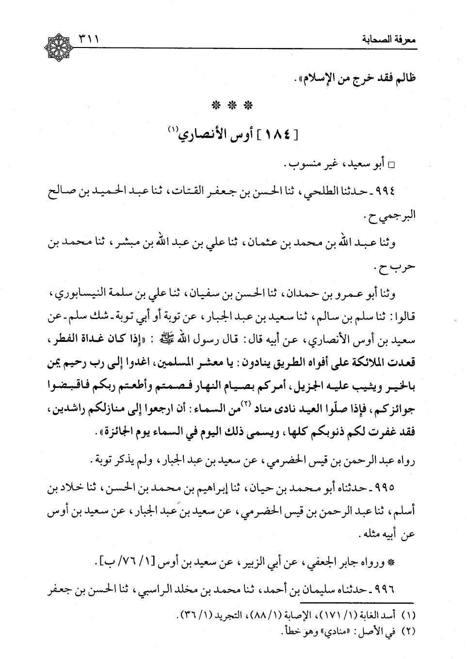 ٩٩٤ - حَدَّثَنَا الطَّلْحِيُّ، ثنا الْحَسَنُ بْنُ جَعْفَرٍ الْقَتَّاتُ، ثنا عَبْدُ الْحَمِيدِ بْنُ صَالِحٍ الْبُرْجُمِيُّ ح وَثَنَا عَبْدُ اللهِ بْنُ مُحَمَّدِ بْنِ عُثْمَانَ، ثنا عَلِيُّ بْنُ عَبْدِ اللهِ بْنِ مُبَشِّرٍ، ثنا مُحَمَّدُ بْنُ حَرْبٍ ح وَثَنَا أَبُو عَمْرِو بْنُ حَمْدَانَ، ثنا الْحَسَنُ بْنُ سُفْيَانَ، ثنا عَلِيُّ بْنُ سَلَمَةَ النَّيْسَابُورِيُّ، قَالُوا: ثنا سَلْمُ بْنُ سَالِمٍ، ثنا سَعِيدُ بْنُ عَبْدِ الْجَبَّارِ، عَنْ تَوْبَةَ، أَوْ أَبِي تَوْبَةَ، شَكَّ سَلْمٌ، عَنْ سَعِيدِ بْنِ أَوْسٍ الْأَنْصَارِيِّ، عَنْ أَبِيهِ، قَالَ: قَالَ رَسُولُ اللهِ صَلَّى اللَّهُ عَلَيْهِ وَسَلَّمَ: " إِذَا كَانَ غَدَاةُ الْفِطْرِ قَعَدَتِ الْمَلَائِكَةُ عَلَى أَفْوَاهِ الطُّرُقِ يُنَادُونَ: يَا مَعْشَرَ الْمُسْلِمِينَ، اغْدُوا إِلَى رَبٍّ رَحِيمٍ، يَمُنُّ بِالْخَيْرِ وَيُثِيبُ عَلَيْهِ الْجَزِيلَ، أَمَرَكُمْ بِصِيَامِ النَّهَارِ فَصُمْتُمْ، وَأَطْعَتُمْ رَبَّكُمْ، فَاقْبَضُوا جَوَائِزَكُمْ، فَإِذَا صَلَّوَا الْعِيدَ نَادَى مُنَادٍ مِنَ السَّمَاءِ أَنِ ارْجِعُوا إِلَى مَنَازِلِكُمْ رَاشِدِينَ، فَقَدْ غُفِرَتْ لَكُمْ ذُنُوبُكُمْ كُلُّهَا، وَيُسَمَّى ذَلِكَ الْيَوْمُ فِي السَّمَاءِ يَوْمَ الْجَائِزَةِ " رَوَاهُ عَبْدُ الرَّحْمَنِ بْنُ قَيْسٍ الْحَضْرَمِيُّ، عَنْ سَعِيدِ بْنِ عَبْدِ الْجَبَّارِ، وَلَمْ يَذْكُرْ تَوْبَةَ