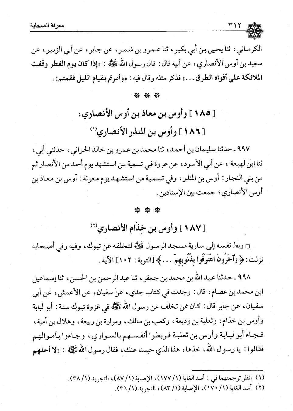 ٩٩٨ - حَدَّثَنَا عَبْدُ اللهِ بْنُ مُحَمَّدِ بْنِ جَعْفَرٍ، ثنا عَبْدُ الرَّحْمَنِ بْنُ الْحَسَنِ، ثنا إِسْمَاعِيلُ بْنُ مُحَمَّدِ بْنِ عِصَامٍ، قَالَ: وَجَدْتُ فِي كِتَابِ جَدِّي: عَنْ سُفْيَانَ، عَنِ الْأَعْمَشِ، عَنْ أَبِي سُفْيَانَ، عَنْ جَابِرٍ، قَالَ: " كَانَ مِمَّنْ تَخَلَّفَ عَنْ رَسُولِ اللهِ صَلَّى اللَّهُ عَلَيْهِ وَسَلَّمَ فِي غَزْوَةِ تَبُوكَ سِتَّةٌ: أَبُو لُبَابَةَ، وَأَوْسُ بْنُ خِذَامٍ، وَثَعْلَبَةُ بْنُ وَدِيعَةَ، وَكَعْبُ بْنُ مَالِكٍ، وَمُرَارَةُ بْنُ رَبِيعَةَ، وَهِلَالُ بْنُ أُمَيَّةَ، فَجَاءَ أَبُو لُبَابَةَ، وَأَوْسُ بْنُ ثَعْلَبَةَ فَرَبَطُوا أَنْفُسَهُمْ بِالسَّوَارِي، وَجَاءُوا بِأَمْوَالِهِمْ، فَقَالُوا: يَا رَسُولَ اللهِ، خُذْهَا، هَذَا الَّذِي حَبَسَنَا عَنْكَ، فَقَالَ رَسُولُ اللهِ صَلَّى اللَّهُ عَلَيْهِ وَسَلَّمَ: «لَا أَحُلُّهُمْ ⦗٣١٣⦘ حَتَّى يَكُونَ قِتَالٌ» فَنَزَلَ الْقُرْآنُ {خَلَطُوا عَمَلًا صَالِحًا وَآخَرَ سَيِّئًا} [التوبة: ١٠٢] إِلَى قَوْلِهِ: {إِنَّ صَلَاتَكَ سَكَنٌ لَهُمْ} [التوبة: ١٠٣] الْآيَةَ "