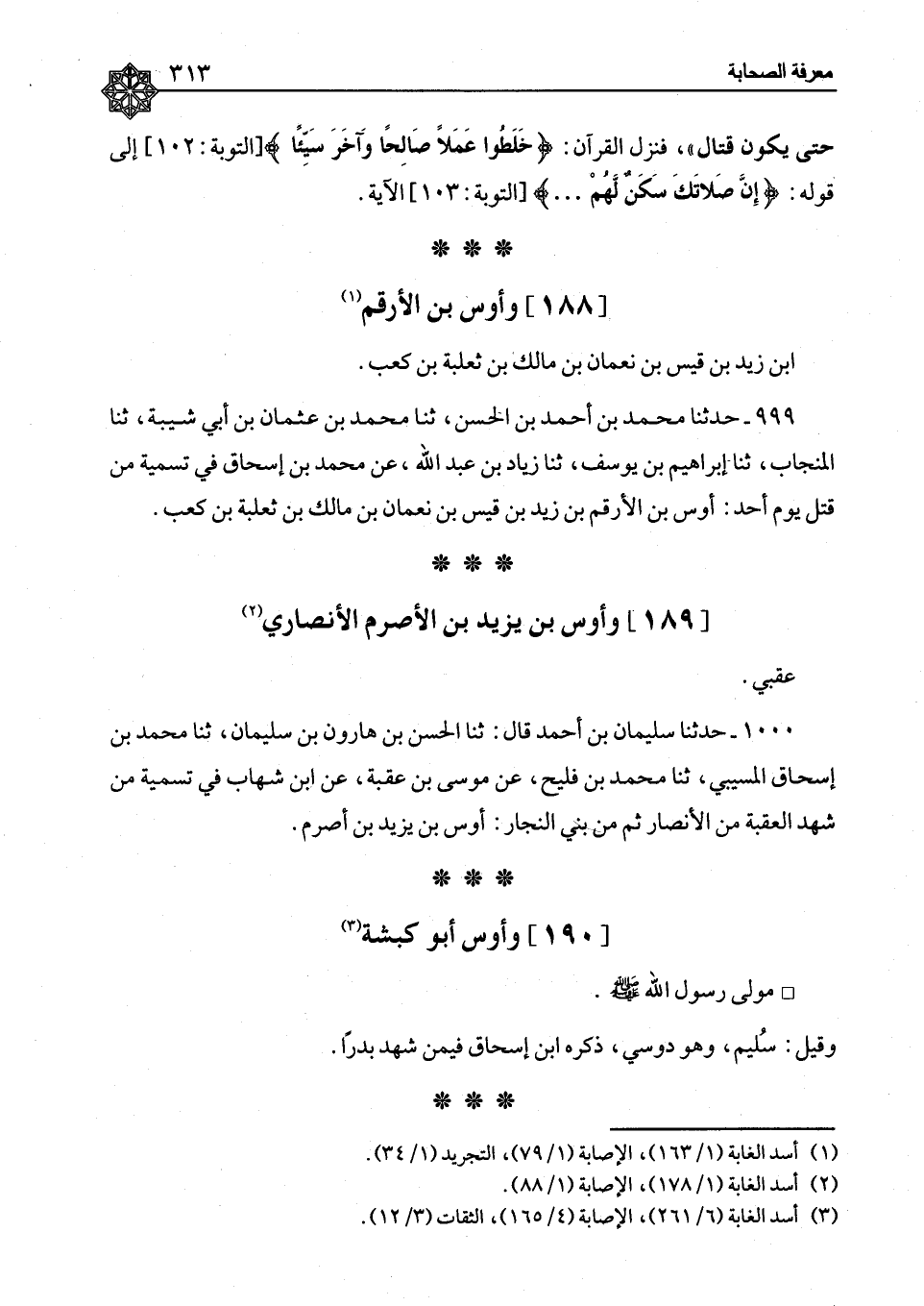 ٩٩٩ - حَدَّثَنَا مُحَمَّدُ بْنُ أَحْمَدَ بْنِ الْحَسَنِ، ثنا مُحَمَّدُ بْنُ عُثْمَانَ بْنِ أَبِي شَيْبَةَ، ثنا الْمِنْجَابُ، ثنا إِبْرَاهِيمُ بْنُ يُوسُفَ، ثنا زِيَادُ بْنُ عَبْدِ اللهِ، عَنْ مُحَمَّدِ بْنِ إِسْحَاقَ، " فِي تَسْمِيَةِ مَنْ قُتِلَ يَوْمَ أُحُدٍ: أَوْسُ بْنُ الْأَرْقَمَ بْنِ زَيْدِ بْنِ قَيْسِ بْنِ نُعْمَانَ بْنِ مَالِكِ بْنِ ثَعْلَبَةَ بْنِ كَعْبٍ "