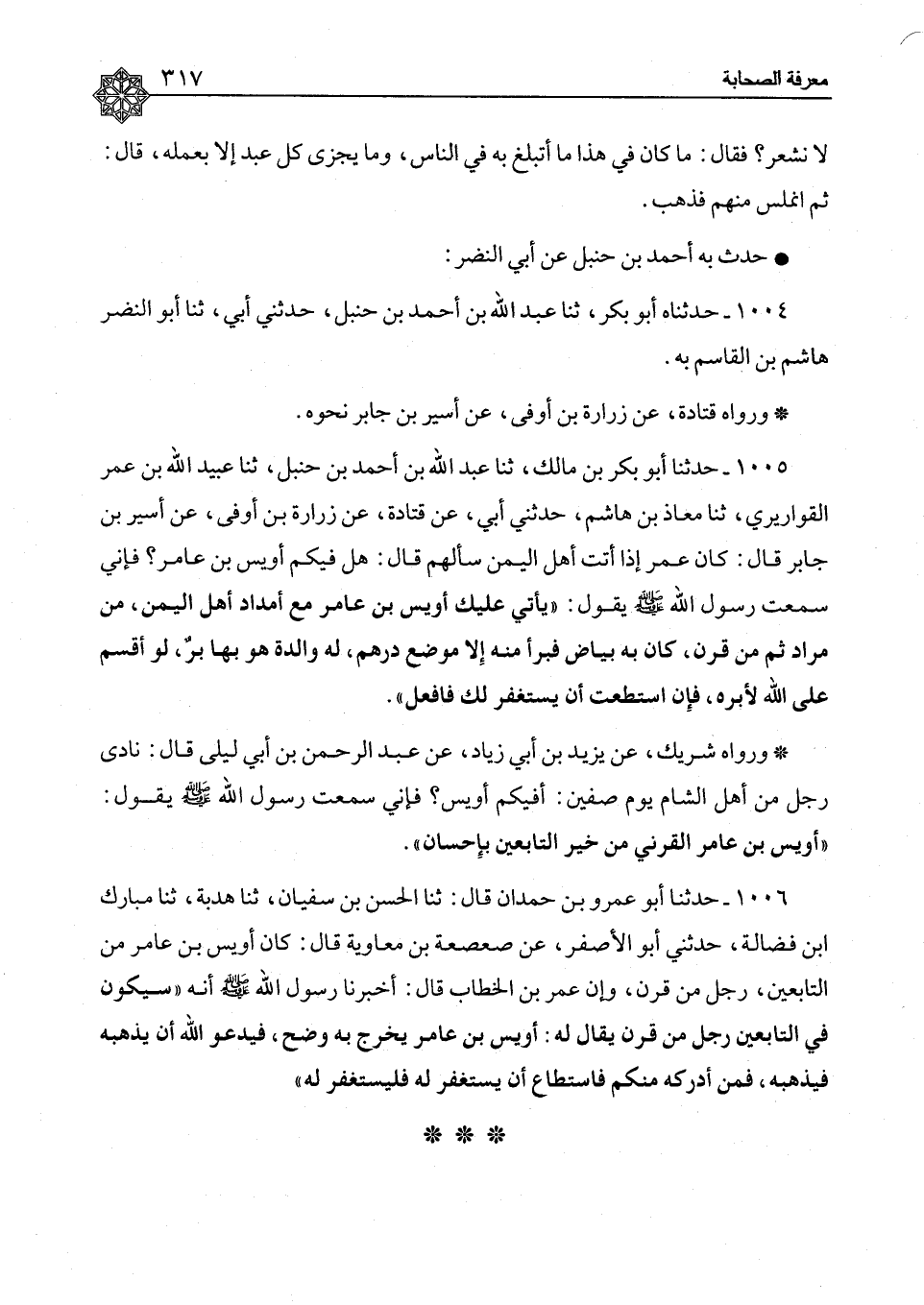 ١٠٠٥ - حَدَّثَنَا أَبُو بَكْرِ بْنُ مَالِكٍ، ثنا عَبْدُ اللهِ بْنُ أَحْمَدَ بْنِ حَنْبَلٍ، ثنا عُبَيْدُ اللهِ بْنُ عُمَرَ الْقَوَارِيرِيُّ، ثنا مُعَاذُ بْنُ هِشَامٍ، حَدَّثَنِي أَبِي، عَنْ قَتَادَةَ، عَنْ زُرَارَةَ بْنِ أَوْفَى، عَنْ أَسِيرِ بْنِ جَابِرٍ، قَالَ: كَانَ عُمَرُ إِذَا أَتَى عَلَيْهِ أَمْدَادُ أَهْلِ الْيَمَنِ سَأَلَهُمْ، قَالَ: هَلْ فِيكُمْ أُوَيْسُ بْنُ عَامِرٍ؟ فَإِنِّي سَمِعْتُ رَسُولَ اللهِ صَلَّى اللَّهُ عَلَيْهِ وَسَلَّمَ يَقُولُ: «يَأْتِي عَلَيْكَ أُوَيْسُ بْنُ عَامِرٍ مَعَ أَمْدَادِ أَهْلِ الْيَمَنِ مِنْ مُرَادٍ، ثُمَّ مِنْ قَرْنٍ، كَانَ بِهِ بَيَاضٌ فَبَرَأَ مِنْهُ إِلَّا مَوْضِعَ دِرْهَمٍ، لَهُ وَالِدَةٌ هُوَ بِهَا بَرٌّ، لَوْ أَقْسَمَ عَلَى اللهِ لَأَبَرَّهُ، فَإِنِ اسْتَطَعْتَ أَنْ يَسْتَغْفِرَ لَكَ فَافْعَلْ» وَرَوَاهُ شَرِيكٌ، عَنْ يَزِيدَ بْنِ أَبِي زِيَادٍ، عَنْ عَبْدِ الرَّحْمَنِ بْنِ أَبِي لَيْلَى، قَالَ: نَادَى رَجُلٌ مِنْ أَهْلِ الشَّامِ يَوْمَ صِفِّينَ: أَفِيكُمْ أُوَيْسٌ، فَإِنِّي سَمِعْتُ رَسُولَ اللهِ صَلَّى اللَّهُ عَلَيْهِ وَسَلَّمَ يَقُولُ: «أُوَيْسُ بْنُ عَامِرٍ الْقَرَنِيُّ مِنْ خَيْرِ التَّابِعِينَ بِإِحْسَانٍ»