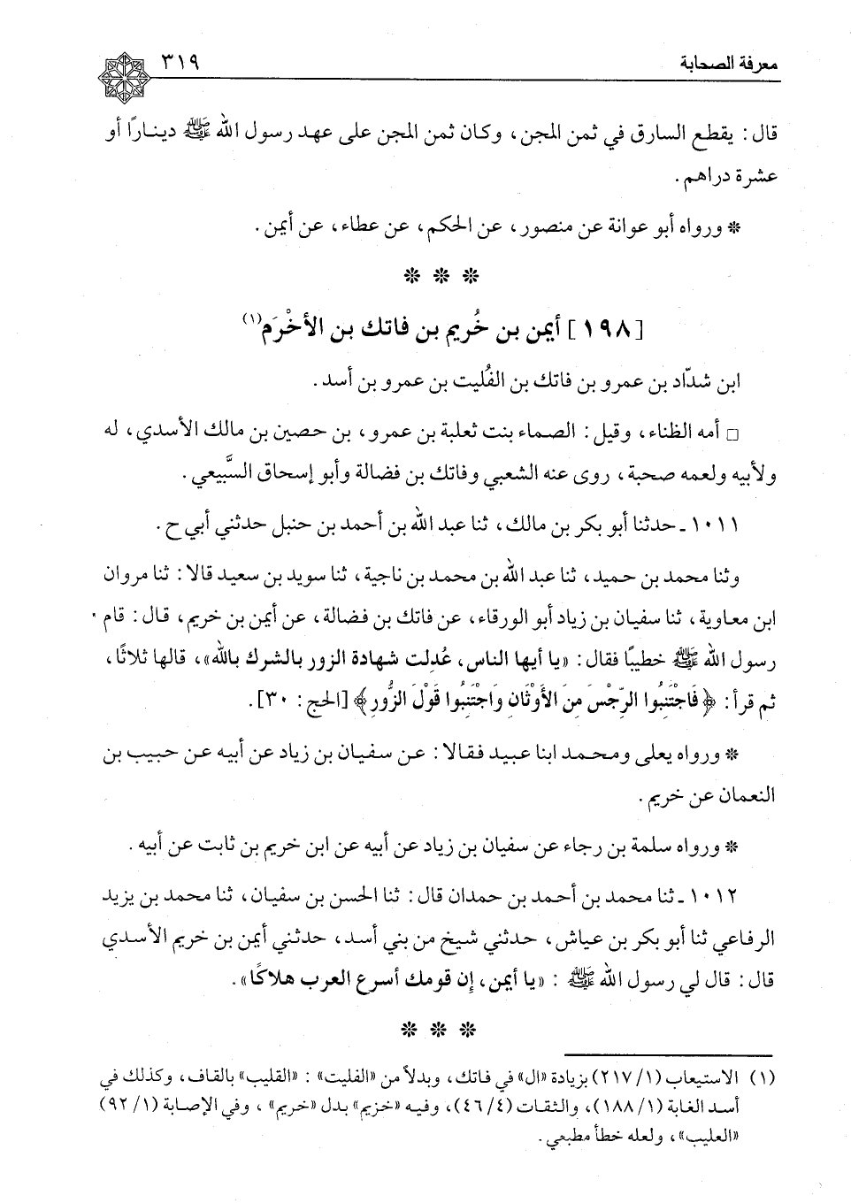 ١٠١٢ - ثنا مُحَمَّدُ بْنُ أَحْمَدَ بْنِ حَمْدَانَ، قَالَ: ثنا الْحَسَنُ بْنُ سُفْيَانَ، ثنا مُحَمَّدُ بْنُ يَزِيدَ الرِّفَاعِيُّ، ثنا أَبُو بَكْرِ بْنُ عَيَّاشٍ، حَدَّثَنِي شَيْخٌ، مِنْ بَنِي أَسَدٍ، حَدَّثَنِي أَيْمَنُ بْنُ خُرَيْمٍ الْأَسَدِيُّ، قَالَ: قَالَ لِي رَسُولُ اللهِ صَلَّى اللَّهُ عَلَيْهِ وَسَلَّمَ: «يَا أَيْمَنُ، إِنَّ قَوْمَكَ أَسْرَعُ الْعَرَبِ هَلَاكًا»