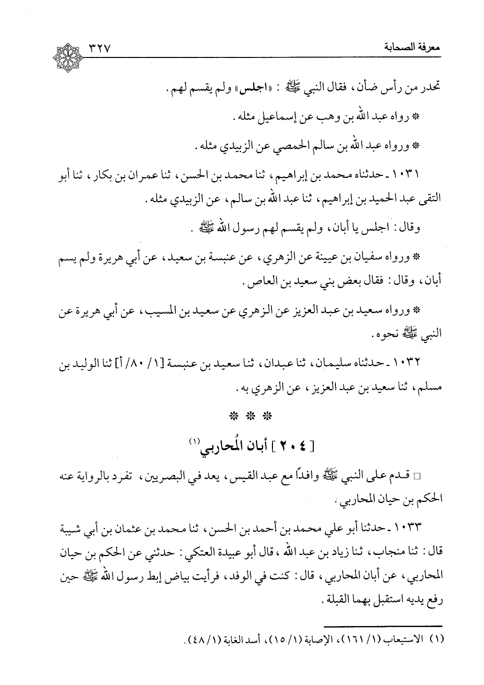 ١٠٣٣ - حَدَّثَنَا أَبُو عَلِيٍّ مُحَمَّدُ بْنُ أَحْمَدَ بْنِ الْحَسَنِ، ثنا مُحَمَّدُ بْنُ عُثْمَانَ بْنِ أَبِي شَيْبَةَ، قَالَ: ثنا مِنْجَابٌ، ثنا زِيَادُ بْنُ عَبْدِ اللهِ، قَالَ: أَبُو عُبَيْدَةَ الْعَتَكِيُّ حَدَّثَنِي، عَنِ الْحَكَمِ بْنِ حَيَّانَ الْمُحَارِبِيِّ، عَنْ أَبَانَ الْمُحَارِبِيِّ، قَالَ: «كُنْتُ فِي الْوَفْدِ، فَرَأَيْتُ بَيَاضَ إِبِطِ رَسُولِ اللهِ صَلَّى اللَّهُ عَلَيْهِ وَسَلَّمَ حِينَ رَفَعَ يَدَيْهِ اسْتَقْبَلَ بِهِمَا الْقِبْلَةَ» ⦗٣٢٨⦘ رَوَاهُ سَعِيدُ بْنُ عَامِرٍ، عَنِ ابْنِ أَبِي عَيَّاشٍ، عَنِ الْحَكَمِ، عَنْ أَبَانَ