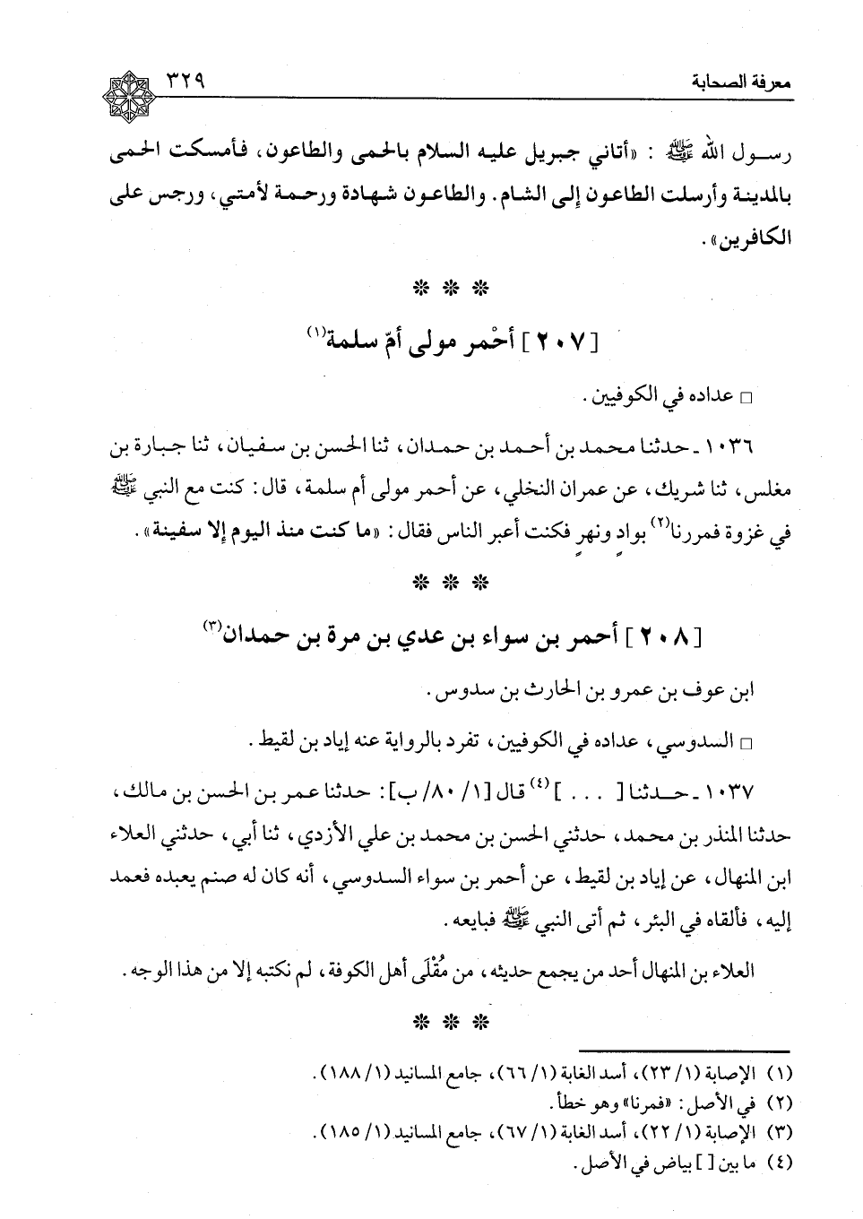 ١٠٣٦ - حَدَّثَنَا مُحَمَّدُ بْنُ أَحْمَدَ بْنِ حَمْدَانَ، ثنا الْحَسَنُ بْنُ سُفْيَانَ، ثنا جُبَارَةُ بْنُ مُغَلِّسٍ، ثنا شَرِيكٌ، عَنْ عِمْرَانَ النَّخْلِيِّ، عَنْ أَحْمَرَ، مَوْلَى أُمِّ سَلَمَةَ قَالَ: كُنْتُ مَعَ النَّبِيِّ صَلَّى اللَّهُ عَلَيْهِ وَسَلَّمَ فِي غَزْوَةٍ، فَمَرَرْنَا بِوَادٍ وَنَهَرٍ، فَكُنْتُ أُعْبِرُ النَّاسَ، فَقَالَ: «مَا كُنْتَ مُنْذُ الْيَوْمِ إِلَّا سَفِينَةً»