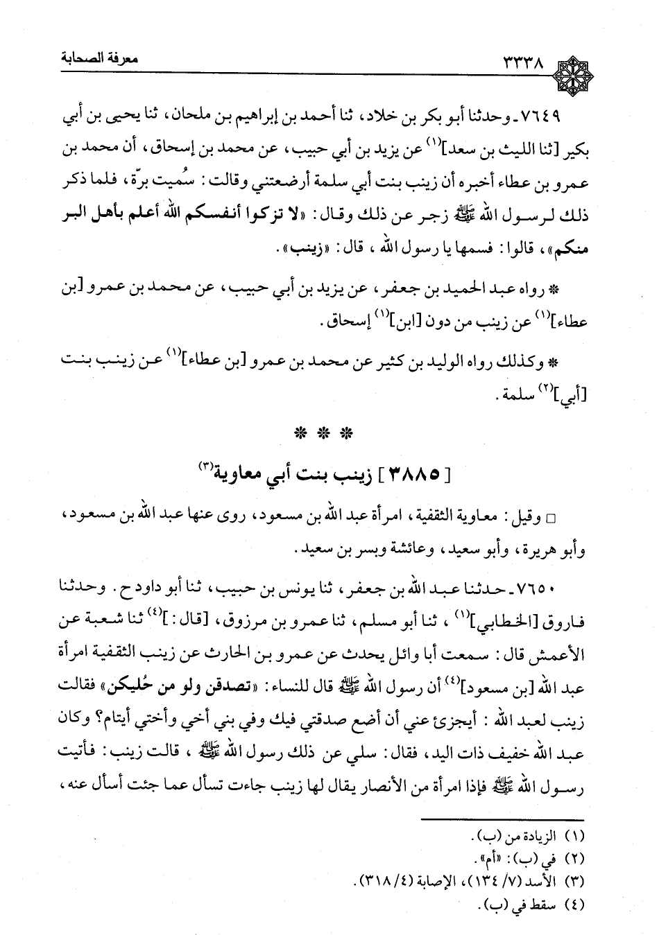 ٧٦٤٩ - وَحَدَّثَنَا أَبُو بَكْرِ بْنُ خَلَّادٍ، ثنا أَحْمَدُ بْنُ إِبْرَاهِيمَ بْنِ مِلْحَانَ، ثنا يَحْيَى أَبِي بْنُ بُكَيْرٍ، ثنا اللَّيْثُ بْنُ سَعْدٍ، عَنْ يَزِيدَ بْنِ أَبِي حَبِيبٍ، عَنْ مُحَمَّدِ بْنِ إِسْحَاقَ، أَنَّ مُحَمَّدَ بْنَ عَمْرِو بْنِ عَطَاءٍ، أَخْبَرَهُ، أَنَّ زَيْنَبَ بِنْتَ أَبِي سَلَمَةَ أَرْضَعَتْنِي، وَقَالَتْ: سَمَّيْتُ بَرَّةَ، فَلَمَّا ذُكِرَ ذَلِكَ لِرَسُولِ اللهِ صَلَّى اللَّهُ عَلَيْهِ وَسَلَّمَ زَجَرَ عَنْ ذَلِكَ، وَقَالَ: «لَا تُزَكُّوا أَنْفُسَكُمْ، اللهُ أَعْلَمُ بِأَهْلِ الْبِرِّ مِنْكُمْ» قَالُوا: فَسَمِّهَا يَا رَسُولَ اللهِ، قَالَ: «زَيْنَبُ» رَوَاهُ عَبْدُ الْحَمِيدِ بْنُ جَعْفَرٍ، عَنْ يَزِيدَ بْنِ أَبِي حَبِيبٍ، عَنْ مُحَمَّدِ بْنِ عَمْرِو بْنِ عَطَاءٍ، عَنْ زَيْنَبَ مِنْ دُونِ ابْنِ إِسْحَاقَ وَكَذَلِكَ رَوَاهُ الْوَلِيدُ بْنُ كَثِيرٍ، عَنْ مُحَمَّدِ بْنِ عَمْرِو بْنِ عَطَاءٍ، عَنْ زَيْنَبَ بِنْتِ أَبِي سَلَمَةَ