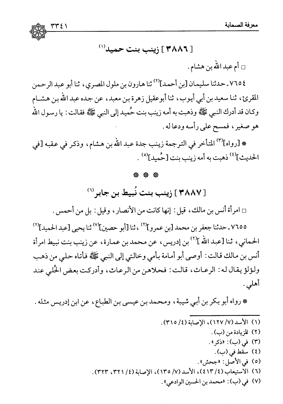 ٧٦٥٥ - حَدَّثَنَا جَعْفَرُ بْنُ مُحَمَّدِ بْنِ عَمْرٍو، ثنا أَبُو حَصِينٍ، ثنا يَحْيَى عَبْدُ الْحَمِيدِ الْحِمَّانِيُّ، ثنا عَبْدُ اللهِ بْنُ إِدْرِيسَ، عَنْ مُحَمَّدِ بْنِ عِمَارَةَ، عَنْ زَيْنَبَ بِنْتِ نُبَيْطٍ، امْرَأَةِ أَنَسِ بْنِ مَالِكٍ، قَالَتْ: أَوْصَى أَبُو أُمَامَةَ بِأُمِّي وَخَالَتِي إِلَى النَّبِيِّ صَلَّى اللَّهُ عَلَيْهِ وَسَلَّمَ، فَأَتَاهُ حُلِيٌّ مِنْ ذَهَبٍ وَلُؤْلُؤٍ يُقَالُ لَهُ: الرِّعَاثُ، قَالَتْ: «فَحَلَّاهُنَّ مِنَ الرِّعَاثِ، وَأَدْرَكْتُ بَعْضَ الْحُلِيِّ عِنْدَ أَهْلِي» رَوَاهُ أَبُو بَكْرِ بْنُ أَبِي شَيْبَةَ، وَمُحَمَّدُ بْنُ عِيسَى بْنِ الطَّبَّاعِ، عَنِ ابْنِ إِدْرِيسَ مِثْلَهُ ⦗٣٣٤٢⦘ وَرَوَاهُ الْمُتَأَخِّرُ فِي التَّرْجَمَةِ زَيْنَبُ بِنْتُ جَابِرٍ الْأَحْمَسِيَّةُ، وَأَخْرَجَ بِعَقِبِهِ هَذَا الْحَدِيثَ مِنْ حَدِيثِ ابْنِ إِدْرِيسَ زَيْنَبُ بِنْتُ نُبَيْطٍ