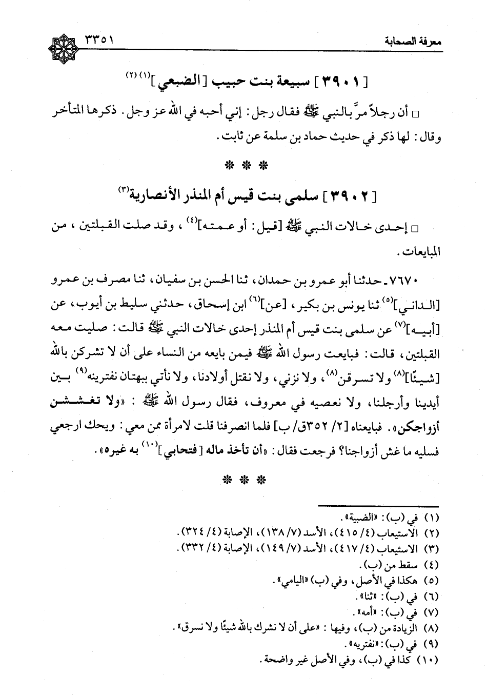 ٧٦٧٠ - حَدَّثَنَا أَبُو عَمْرِو بْنُ حَمْدَانَ، ثنا الْحَسَنُ بْنُ سُفْيَانَ، ثنا مُصَرِّفُ بْنُ عَمْرٍو الدَّانِيُّ، ثنا يُونُسُ بْنُ بُكَيْرٍ، عَنِ ابْنِ إِسْحَاقَ، حَدَّثَنِي سَلِيطُ بْنُ أَيُّوبَ، عَنْ أَبِيهِ، عَنْ سَلْمَى بِنْتِ قَيْسٍ أُمِّ الْمُنْذِرِ، إِحْدَى خَالَاتِ النَّبِيِّ صَلَّى اللَّهُ عَلَيْهِ وَسَلَّمَ، قَالَتْ: صَلَّيْتُ مَعَهُ الْقِبْلَتَيْنِ، قَالَتْ: فَبَايَعْتُ رَسُولَ اللهِ صَلَّى اللَّهُ عَلَيْهِ وَسَلَّمَ فِيمَنْ بَايَعَهُ مِنَ النِّسَاءِ عَلَى أَنْ لَا تُشْرِكْنَ بِاللهِ شَيْئًا، وَلَا تَسْرِقْنَ، وَلَا نَزْنِيَ، وَلَا نَقْتُلَ أَوْلَادَنَا، وَلَا نَأْتِي بِبُهْتَانٍ نَفْتَرِينَهُ بَيْنَ أَيْدِينَا وَأَرْجُلِنَا، وَلَا نَعْصِيَهُ فِي مَعْرُوفٍ، فَقَالَ رَسُولُ اللهِ صَلَّى اللَّهُ عَلَيْهِ وَسَلَّمَ: «وَلَا تَغْشُشْنَ أَزْوَاجَكُنَّ» فَبَايَعْنَاهُ، فَلَمَّا انْصَرَفْنَا قُلْتُ لِامْرَأَةٍ مِمَّنْ مَعِي: وَيْحَكِ ارْجِعِي فَسَلِيهِ مَا غِشُّ أَزْوَاجِنَا فَرَجَعْتُ، فَقَالَ: «أَنْ تَأْخُذَ مَالَهُ فَتُحَابِي بِهِ غَيْرَهُ»