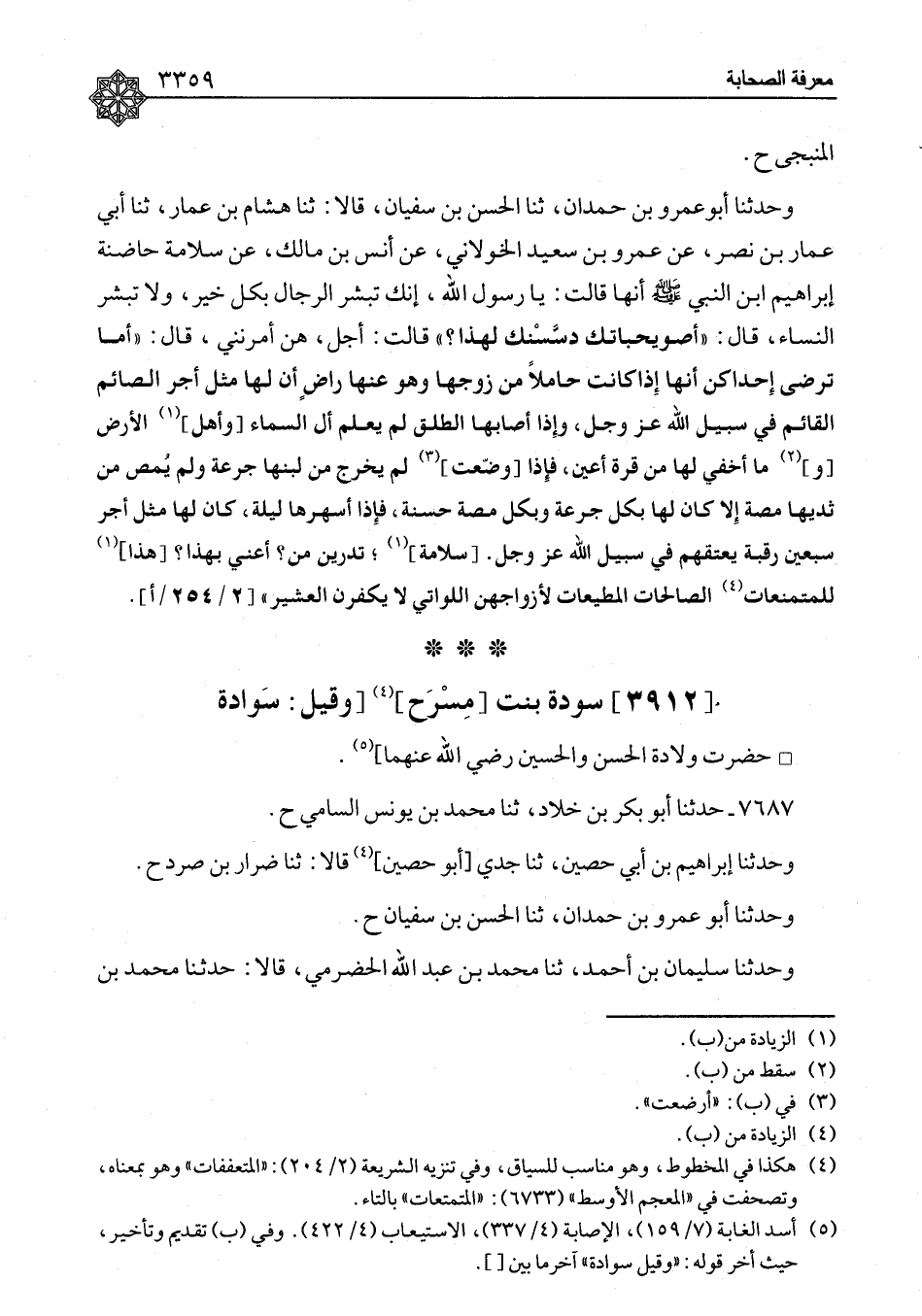٧٦٨٧ - حَدَّثَنَا أَبُو بَكْرِ بْنُ خَلَّادٍ، ثنا مُحَمَّدُ بْنُ يُونُسَ السَّامِيُّ، ح، وَحَدَّثَنَا إِبْرَاهِيمُ بْنُ أَبِي حَصِينٍ، ثنا جَدِّي أَبُو حَصِينٍ، قَالَا: ثنا ضِرَارُ بْنُ صُرَدَ، ح، وَحَدَّثَنَا أَبُو عَمْرِو بْنُ حَمْدَانَ، ثنا الْحَسَنُ بْنُ سُفْيَانَ، ح، وَحَدَّثَنَا سُلَيْمَانُ بْنُ أَحْمَدَ، ثنا مُحَمَّدُ بْنُ عَبْدِ اللهِ الْحَضْرَمِيُّ، قَالَا: حَدَّثَنَا مُحَمَّدُ بْنُ ⦗٣٣٦٠⦘ طَرِيفٍ، قَالُوا: ثنا مُحَمَّدُ بْنُ فُضَيْلٍ الضَّبِّيُّ، عَنْ عَلِيِّ بْنِ مَيْسَرَةَ، عَنْ عُمَرِ بْنِ عُمَيْرٍ، عَنْ عُرْوَةَ بْنِ فَيْرُوزٍ، عَنْ سَوْدَةَ بِنْتِ مِسْرَحٍ، قَالَتْ: كُنْتُ فِيمَنْ حَضَرَ فَاطِمَةَ بِنْتَ النَّبِيِّ صَلَّى اللَّهُ عَلَيْهِ وَسَلَّمَ حِينَ ضَرَبَهَا الْمَخَاضُ فِي نِسْوَةٍ، قَالَتْ: فَأَتَانَا رَسُولُ اللهِ صَلَّى اللَّهُ عَلَيْهِ وَسَلَّمَ، فَقَالَ: «كَيْفَ هِيَ؟ كَيْفَ ابْنَتِي فَدَيْتُهَا؟» قَالَتْ: قُلْتُ: إِنَّهَا لَتَجْهَدُ يَا رَسُولَ اللهِ، قَالَ: «فَإِذَا وَلَدَتْ فَلَا تَسْبِقِينِي فِيهِ بِشَيْءٍ» قَالَتْ: فَوَضَعَتْ فَسَرَرْتُهُ وَلَفَفْتُهُ فِي خِرْقَةٍ صَفْرَاءَ، فَحَنَّكْتُهُ، فَجَاءَ النَّبِيُّ صَلَّى اللَّهُ عَلَيْهِ وَسَلَّمَ، فَقَالَ: «كَيْفَ هِيَ؟» قُلْتُ: قَدْ وَضَعَتْ يَا رَسُولَ اللهِ، وَلَفَفْتُهُ فِي خِرْقَةٍ وَحَنَّكْتُهُ، وَقَالَ: «قَدْ عَصَيْتِنِي» قُلْتُ: أَعُوذُ بِاللهِ مِنْ مَعْصِيَتِهِ وَمَعْصِيَةِ رَسُولِهِ، لَفَفْتُهُ وَحَنَّكْتُهُ، وَلَمْ أَجِدْ مِنْ ذَلِكَ بُدًا، قَالَ: «ائْتِنِي بِهِ» فَأَلْقَى عَنْهُ الْخِرْقَةَ الصَّفْرَاءَ وَلَفَّهُ فِي خِرْقَةٍ بَيْضَاءَ، وَتَفَلَ فِي فِيهِ وَالْبَاهُ بَرِيقِهِ وَجَاءَ عَلِيٌّ رَضِيَ اللهُ عَنْهُ، فَقَالَ: «مَا سَمَّيْتَهُ يَا عَلِيُّ؟» قَالَ: سَمَّيْتُهُ جَعْفَرًا، قَالَ: «لَا، وَلَكِنَّهُ حَسَنٌ، وَبَعْدَهُ حُسَيْنٌ، وَأَنْتَ أَبُو حَسَنِ الْخَيْرِ» وَقَالَ أَبُو حَصِينٍ فِي حَدِيثِهِ: سَوَادَةُ، وَقَالَ ابْنُ طَرِيفٍ، وَمُحَمَّدُ بْنُ يُونُسَ سَوْدَةُ، وَذَكَرَ التَّحْنِيكَ فِي حَدِيثِ سُلَيْمَانَ، وَلَمْ يَذْكُرْ غَيْرَهُ