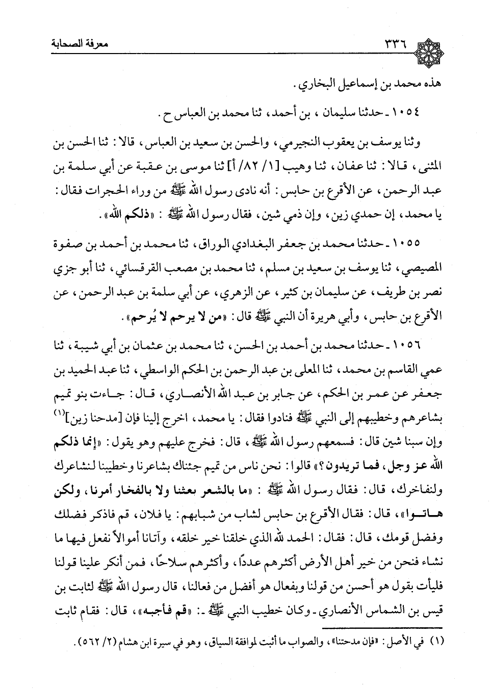 ١٠٥٦ - حَدَّثَنَا مُحَمَّدُ بْنُ أَحْمَدَ بْنِ الْحَسَنِ، ثنا مُحَمَّدُ بْنُ عُثْمَانَ بْنِ أَبِي شَيْبَةَ، ثنا عَمِّي الْقَاسِمُ بْنُ مُحَمَّدٍ، ثنا الْمُعَلَّى بْنُ عَبْدِ الرَّحْمَنِ بْنِ الْحَكَمِ الْوَاسِطِيُّ، ثنا عَبْدُ الْحَمِيدِ بْنُ جَعْفَرٍ، عَنْ عُمَرَ بْنِ الْحَكَمِ، عَنْ جَابِرِ بْنِ عَبْدِ اللهِ الْأَنْصَارِيِّ، قَالَ: جَاءَتْ بَنُو تَمِيمٍ بِشَاعِرِهِمْ وَخَطِيبِهِمْ إِلَى النَّبِيِّ صَلَّى اللَّهُ عَلَيْهِ وَسَلَّمَ فَنَادَوْا، فَقَالَ: يَا مُحَمَّدُ اخْرُجْ إِلَيْنَا، فَإِنَّ مَدْحَنَا زَيْنٌ، وَإِنَّ سَبَّنَا شَيْنٌ، قَالَ: فَسَمِعَهُمْ رَسُولُ اللهِ صَلَّى اللَّهُ عَلَيْهِ وَسَلَّمَ قَالَ: فَخَرَجَ عَلَيْهِمْ وَهُوَ يَقُولُ: «إِنَّمَا ذَلِكُمُ اللهُ عَزَّ وَجَلَّ، فَمَا تُرِيدُونَ؟» ، قَالُوا: نَحْنُ نَاسٌ مِنْ تَمِيمٍ، جِئْنَاكَ بِشَاعِرِنَا وَخَطِيبِنَا لِنُشَاعِرَكَ وَلِنُفَاخِرَكَ، قَالَ: فَقَالَ رَسُولُ اللهِ صَلَّى اللَّهُ عَلَيْهِ وَسَلَّمَ: «مَا بِالشِّعْرِ بُعِثْنَا، وَلَا بِالْفَخَارِ أُمِرْنَا، وَلَكِنْ هَاتُوا» ، قَالَ: فَقَالَ الْأَقْرَعُ بْنُ حَابِسٍ لِشَابٍّ مِنْ شَبَابِهِمْ: يَا فُلَانُ قُمْ فَاذْكُرْ فَضْلَكَ، وَفَضْلَ قَوْمِكَ، قَالَ: فَقَالَ: الْحَمْدُ لِلَّهِ الَّذِي خَلَقَنَا خَيْرَ خَلْقِهِ، وَآتَانَا أَمْوَالًا نَفْعَلُ فِيهَا مَا نَشَاءُ، فَنَحْنُ مِنْ خَيْرِ أَهْلِ الْأَرْضِ، أَكْثَرُهُمْ عَدَدًا، وَأَكْثَرُهُمْ سِلَاحًا، فَمَنْ أَنْكَرَ عَلَيْنَا قَوْلَنَا فَلْيَأْتِ بِقَوْلٍ هُوَ أَحْسَنُ مِنْ قَوْلِنَا، وَبِفِعَالٍ هُوَ أَفْضَلُ مِنْ فِعَالِنَا، قَالَ رَسُولُ اللهِ صَلَّى اللَّهُ عَلَيْهِ وَسَلَّمَ لِثَابِتِ بْنِ قَيْسِ بْنِ الشَّمَّاسِ الْأَنْصَارِيِّ، وَكَانَ خَطِيبَ النَّبِيِّ صَلَّى اللَّهُ عَلَيْهِ وَسَلَّمَ: «قُمْ فَأَجِبْهُ» قَالَ: فَقَامَ ثَابِتٌ ⦗٣٣٧⦘ فَقَالَ: الْحَمْدُ لِلَّهِ، أَحْمَدُهُ وَأَسْتَعِينُهُ، وَأَؤْمِنُ بِهِ، وَأَتَوَكَّلُ عَلَيْهِ، وَأَشْهَدُ أَنْ لَا إِلَهَ إِلَّا اللهُ وَحْدَهُ لَا شَرِيكَ لَهُ، وَأَنَّ مُحَمَّدًا عَبْدُهُ وَرَسُولُهُ، وَدَعَا الْمُهَاجِرِينَ مِنْ بَنِي عَمِّهِ أَحْسَنَ النَّاسِ وُجُوهًا، وَأَعْظَمَ النَّاسِ أَحْلَامًا فَأَجَابُوهُ، الْحَمْدُ لِلَّهِ الَّذِي جَعَلْنَا أَنْصَارَهُ وَوزَرَاءَ رَسُولِهِ، وَعِزًّا لِدِينِهِ، فَنَحْنُ نُقَاتِلُ النَّاسَ حَتَّى يَشْهَدُوا أَنْ لَا إِلَهَ إِلَّا اللهُ، فَمَنْ قَالَهَا مَنَعَ مِنَّا مَالَهُ وَنَفْسَهُ، وَمَنْ أَبَاهَا قَاتَلْنَاهُ، وَكَانَ رَغْمُهُ فِي اللهِ عَلَيْنَا هَيِّنًا، أَقُولُ قُولِي هَذَا وَأَسْتَغْفِرُ اللهَ لِلْمُؤْمِنِينَ وَالْمُؤْمِنَاتِ، قَالَ: فقَالَ الزِّبْرِقَانُ بْنُ بَدْرٍ لِرَجُلٍ مِنْهُمْ: يَا فُلَانُ، قُمْ فَقُلْ أَبْيَاتًا تَذْكُرُ فِيهَا فَضْلَكَ، وَفَضْلَ قَوْمِكَ، فَقَالَ: