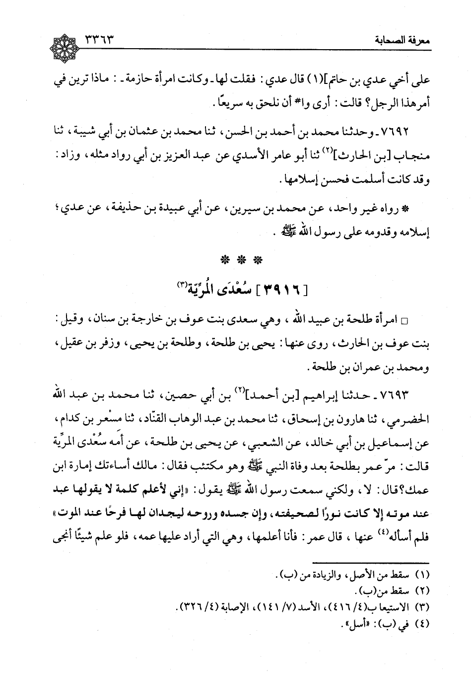 ٧٦٩٣ - حَدَّثَنَا إِبْرَاهِيمُ بْنُ أَحْمَدَ بْنِ أَبِي حَصِينٍ، ثنا مُحَمَّدُ بْنُ عَبْدِ اللهِ الْحَضْرَمِيُّ، ثنا هَارُونُ بْنُ إِسْحَاقَ، ثنا مُحَمَّدُ بْنُ عَبْدِ الْوَهَّابِ الْقَنَّادُ، ثنا مِسْعَرُ بْنُ كِدَامٍ، عَنْ إِسْمَاعِيلَ بْنِ أَبِي خَالِدٍ، عَنِ الشَّعْبِيِّ، عَنْ يَحْيَى بْنِ طَلْحَةَ، عَنْ أُمِّهِ، سُعْدَى الْمُرِّيَّةِ، قَالَتْ: مَرَّ عُمَرُ بِطَلْحَةَ بَعْدَ وَفَاةِ النَّبِيِّ صَلَّى اللَّهُ عَلَيْهِ وَسَلَّمَ، وَهُوَ مُكْتَئِبٌ، فَقَالَ: مَالَكَ أَسَاءَتْكَ إِمَارَةُ ابْنِ عَمِّكَ؟ قَالَ: لَا، وَلَكِنِّي سَمِعْتُ رَسُولَ اللهِ صَلَّى اللَّهُ عَلَيْهِ وَسَلَّمَ، يَقُولُ: «إِنِّي لَأَعْلَمُ كَلِمَةً لَا يَقُولُهَا عَبْدٌ عِنْدَ مَوْتِهِ إِلَّا كَانَتْ نُورًا لِصَحِيفَتِهِ، وَإِنَّ جَسَدَهُ وَرُوحَهُ لَيَجِدَانِ لَهَا فَرَحًا عِنْدَ الْمَوْتِ» فَلَمْ أَسْأَلْهُ عَنْهَا، قَالَ عُمَرُ: فَأَنَا أَعْلَمُهَا، وَهِيَ الَّتِي أَرَادَ عَلَيْهَا عَمَّهُ، فَلَوْ عَلِمَ شَيْئًا أَنْجَى ⦗٣٣٦٤⦘ لَهُ مِنْهَا لَأَمَرَهُ "