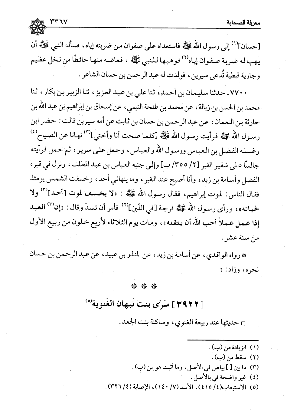 ٧٧٠٠ - حَدَّثَنَا سُلَيْمَانُ بْنُ أَحْمَدَ، ثنا عَلِيُّ بْنُ عَبْدِ الْعَزِيزِ، ثنا الزُّبَيْرُ بْنُ بَكَّارٍ، ثنا مُحَمَّدُ بْنُ الْحَسَنِ بْنِ زَبَالَةَ، عَنْ مُحَمَّدِ بْنِ طَلْحَةَ التَّيْمِيِّ، عَنْ إِسْحَاقَ بْنِ إِبْرَاهِيمَ بْنِ عَبْدِ اللهِ بْنِ حَارِثَةَ بْنِ النُّعْمَانِ، عَنْ عَبْدِ الرَّحْمَنِ بْنِ حَسَّانَ بْنِ ثَابِتٍ، عَنْ أُمِّهِ سِيرِينَ، قَالَتْ: حُضِرَ ابْنُ رَسُولِ اللهِ صَلَّى اللَّهُ عَلَيْهِ وَسَلَّمَ فَرَأَيْتُ رَسُولَ اللهِ صَلَّى اللَّهُ عَلَيْهِ وَسَلَّمَ كُلَّمَا صِحْتُ أَنَا وَأُخْتِي نَهَانَا عَنِ الصَّيَّاحِ، وَغَسَّلَهُ الْفَضْلُ بْنُ الْعَبَّاسِ، وَرَسُولُ اللهِ وَالْعَبَّاسُ، وَجُعِلَ عَلَى سَرِيرٍ، ثُمَّ حُمِلَ فَرَأَيْتُهُ جَالِسًا عَلَى شَفِيرِ الْقَبْرِ، وَإِلَى جَنْبِهِ الْعَبَّاسُ بْنُ عَبْدِ الْمُطَّلِبِ، وَنَزَلَ فِي قَبْرِهِ الْفَضْلُ، وَأُسَامَةُ بْنُ زَيْدٍ، وَأَنَا أَصِيحُ عِنْدَ الْقَبْرِ، وَمَا يَنْهَانِي أَحَدٌ، وَخُسِفَتِ الشَّمْسُ يَوْمَئِذٍ، فَقَالَ النَّاسُ: لِمَوْتِ إِبْرَاهِيمَ، فَقَالَ رَسُولُ اللهِ صَلَّى اللَّهُ عَلَيْهِ وَسَلَّمَ: «لَا يُخْسَفُ لِمَوْتِ أَحَدٍ، وَلَا لِحَيَاتِهِ» وَرَأَى رَسُولُ اللهِ صَلَّى اللَّهُ عَلَيْهِ وَسَلَّمَ فُرْجَةً فِي اللَّبِنِ، فَأَمَرَ أَنْ تُسَدَّ، وَقَالَ: «إِنَّ الْعَبْدَ إِذَا عَمِلَ عَمَلًا أَحَبَّ اللهُ أَنْ يُتْقِنَهُ» وَمَاتَ يَوْمَ الثُّلَاثَاءِ لِأَرْبَعٍ خَلَوْنَ مِنْ رَبِيعٍ الْأَوَّلِ مِنْ سَنَةِ عَشْرٍ " رَوَاهُ الْوَاقِدِيُّ، عَنْ أُسَامَةَ بْنِ زَيْدٍ، عَنِ الْمُنْذِرِ بْنِ عُبَيْدٍ، عَنْ عَبْدِ الرَّحْمَنِ بْنِ حَسَّانَ، نَحْوَهُ، وَزَادَ