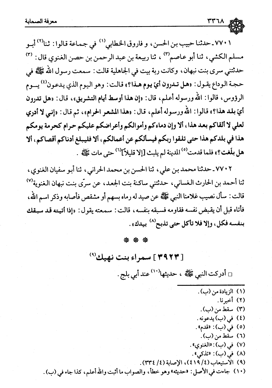 ٧٧٠١ - حَدَّثَنَا حَبِيبُ بْنُ الْحَسَنِ، وَفَارُوقٌ الْخَطَّابِيُّ، فِي جَمَاعَةٍ، قَالُوا: ثنا أَبُو مُسْلِمٍ الْكَشِّيُّ، ثنا أَبُو عَاصِمٍ، ثنا رَبِيعَةُ بْنُ عَبْدِ الرَّحْمَنِ بْنِ حِصْنٍ الْغَنَوِيُّ، قَالَ: حَدَّثَتْنِي سَرَّى بِنْتُ نَبْهَانَ وَكَانَتْ، رَبَّةَ بَيْتٍ فِي الْجَاهِلِيَّةِ، قَالَتْ: سَمِعْتُ رَسُولَ اللهِ صَلَّى اللَّهُ عَلَيْهِ وَسَلَّمَ فِي حِجَّةِ الْوَدَاعِ يَقُولُ: «هَلْ تَدْرُونَ أَيَّ يَوْمٍ هَذَا؟» قَالَتْ: وَهُوَ الْيَوْمُ الَّذِي يَدْعُونَ يَوْمَ الرُّءُوسَ، قَالُوا: اللهُ وَرَسُولُهُ أَعْلَمُ، قَالَ: «إِنَّ هَذَا أَوْسَطُ أَيَّامِ التَّشْرِيقِ» قَالَ: «هَلْ تَدْرُونَ أَيَّ بَلَدٍ هَذَا؟» قَالُوا: اللهُ وَرَسُولُهُ أَعْلَمُ، قَالَ: «هَذَا الْمَشْعَرُ الْحَرَامُ» ثُمَّ قَالَ: «إِنِّي لَا أَدْرِي لَعَلِّي لَا أَلْقَاكُمُ بَعْدَ هَذَا، أَلَا وَإِنَّ دِمَاءَكُمْ، وَأَمْوَالَكُمْ، وَأَعْرَاضَكُمْ عَلَيْكُمْ حَرَامٌ كَحُرْمَةِ يَوْمِكُمْ هَذَا فِي بَلَدِكُمْ هَذَا حَتَّى تَلْقَوْا رَبَّكُمْ، فَيَسْأَلَكُمْ عَنْ أَعْمَالِكُمْ، أَلَا فَلْيُبَلِّغْ أَدْنَاكُمْ أَقْصَاكُمْ، أَلَا هَلْ بَلَّغْتُ؟» فَلَمَّا قَدِمْتُ الْمَدِينَةَ لَمْ يَلْبَثْ إِلَّا قَلِيلًا حَتَّى مَاتَ صَلَّى اللَّهُ عَلَيْهِ وَسَلَّمَ "