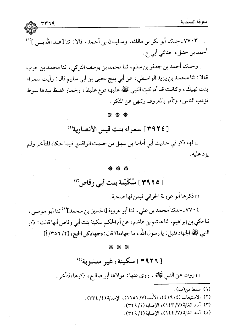 ٧٧٠٣ - حَدَّثَنَا أَبُو بَكْرِ بْنُ مَالِكٍ، وَسُلَيْمَانُ بْنُ أَحْمَدَ، قَالَا: ثنا عَبْدُ اللهِ بْنُ أَحْمَدَ بْنِ حَنْبَلٍ، حَدَّثَنِي أَبِي، ح وَحَدَّثَنَا أَحْمَدُ بْنُ جَعْفَرِ بْنِ سَلْمٍ، ثنا مُحَمَّدُ بْنُ يُوسُفَ التُّرْكِيُّ، ثنا مُحَمَّدُ بْنُ حَرْبٍ، قَالَا: ثنا مُحَمَّدُ بْنُ يَزِيدَ الْوَاسِطِيُّ، عَنْ أَبِي بَلْجٍ يَحْيَى بْنِ أَبِي سُلَيْمٍ، قَالَ: «رَأَيْتُ سَمْرَاءَ بِنْتَ نَهِيكٍ، وَكَانَتْ قَدْ أَدْرَكَتِ النَّبِيَّ صَلَّى اللَّهُ عَلَيْهِ وَسَلَّمَ عَلَيْهَا دِرْعٌ غَلِيظٌ، وَخِمَارٌ غَلِيظٌ، بِيَدِهَا سَوْطٌ تُؤَدِّبُ النَّاسَ، وَتَأْمُرُ بِالْمَعْرُوفِ، وَتَنْهَى عَنِ الْمُنْكَرِ»