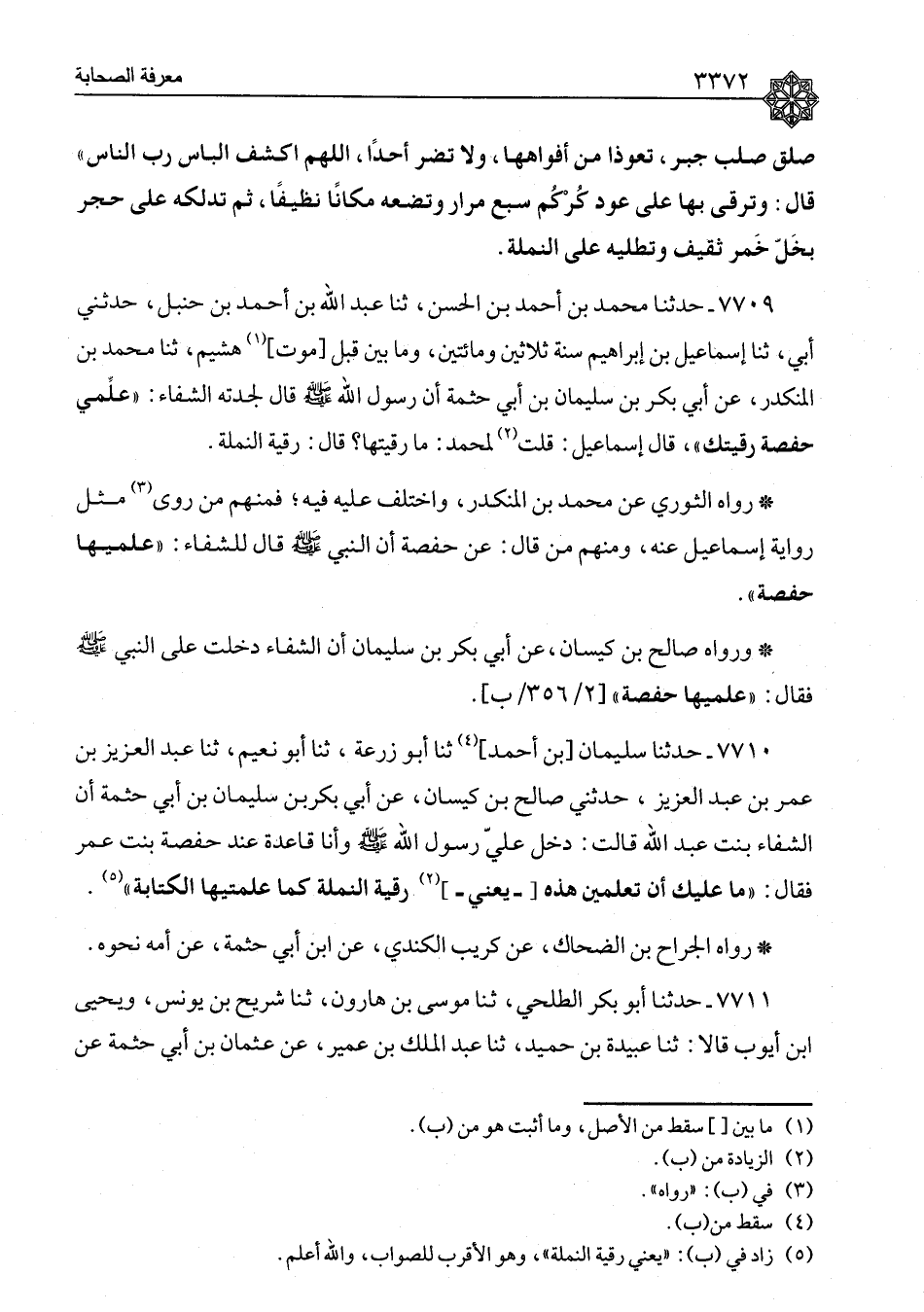 ٧٧٠٩ - حَدَّثَنَا مُحَمَّدُ بْنُ أَحْمَدَ بْنِ الْحَسَنِ، ثنا عَبْدُ اللهِ بْنُ أَحْمَدَ بْنِ حَنْبَلٍ، حَدَّثَنِي أَبِي، ثنا إِسْمَاعِيلُ بْنُ إِبْرَاهِيمَ، سَنَةَ ثَلَاثِينَ وَمِائَتَيْنِ، وَمَا بَيْنَ قَبْلِ مَوْتِ هُشَيْمٍ، ثنا مُحَمَّدُ بْنُ الْمُنْكَدِرِ، عَنْ أَبِي بَكْرِ بْنِ سُلَيْمَانَ بْنِ أَبِي حَثْمَةَ، أَنَّ رَسُولَ اللهِ صَلَّى اللَّهُ عَلَيْهِ وَسَلَّمَ قَالَ لِجَدَّتِهِ الشِّفَاءِ: «عَلِّمِي حَفْصَةَ رُقْيَتَكِ» قَالَ إِسْمَاعِيلُ: قُلْتُ لِمُحَمَّدٍ: مَا رُقْيَتُهَا؟ قَالَ: رُقْيَةُ النَّمْلَةِ " رَوَاهُ الثَّوْرِيُّ، عَنْ مُحَمَّدِ بْنِ الْمُنْكَدِرِ، وَاخْتُلِفَ عَلَيْهِ فِيهِ، فَمِنْهُمْ مَنْ رَوَى مِثْلَ رِوَايَةِ إِسْمَاعِيلَ عَنْهُ، وَمِنْهُمْ مَنْ قَالَ: عَنْ حَفْصَةَ، أَنَّ النَّبِيَّ صَلَّى اللَّهُ عَلَيْهِ وَسَلَّمَ، قَالَ لِلشِّفَاءِ: «عَلِّمِيهَا حَفْصَةَ» وَرَوَاهُ صَالِحُ بْنُ كَيْسَانَ، عَنْ أَبِي بَكْرِ بْنِ سُلَيْمَانَ، أَنَّ الشِّفَاءَ دَخَلَتْ عَلَى النَّبِيِّ صَلَّى اللَّهُ عَلَيْهِ وَسَلَّمَ، فَقَالَ: «عَلِّمِيهَا حَفْصَةَ»