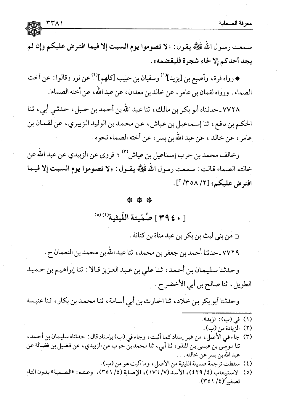 ٧٧٢٨ - وَخَالَفَ مُحَمَّدُ بْنُ حَرْبٍ إِسْمَاعِيلَ بْنَ عَيَّاشٍ، فَرَوَى عَنِ الزُّبَيْدِيِّ، عَنْ عَبْدِ اللهِ، عَنْ خَالَتِهِ الصَّمَّاءِ، قَالَتْ: سَمِعْتُ رَسُولَ اللهِ صَلَّى اللَّهُ عَلَيْهِ وَسَلَّمَ، يَقُولُ: «لَا تَصُومُوا يَوْمَ السَّبْتِ، إِلَّا فِيمَا افْتَرَضَ عَلَيْكُمْ»