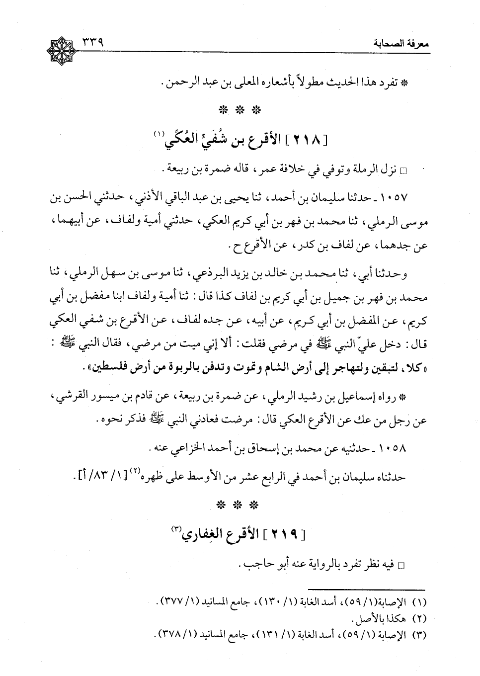 ١٠٥٧ - حَدَّثَنَا سُلَيْمَانُ بْنُ أَحْمَدَ، ثنا يَحْيَى بْنُ عَبْدِ الْبَاقِي الْأَذَنِيُّ، حَدَّثَنِي الْحَسَنُ بْنُ مُوسَى الرَّمْلِيُّ، ثنا مُحَمَّدُ بْنُ فِهْرِ بْنِ أَبِي كَرِيمٍ الْعَكِّيُّ، حَدَّثَنِي أُمَيَّةُ، وَلَفَّافٌ، عَنْ أَبِيهِمَا، عَنْ جَدِّهِمَا، عَنْ لَفَّافِ بْنِ كُدْرٍ، عَنِ الْأَقْرَعِ ح وَحَدَّثَنَا أَبِي، ثنا مُحَمَّدُ بْنُ خَالِدِ بْنِ يَزِيدَ الْبَرْذَعِيُّ، ثنا مُوسَى بْنُ سَهْلٍ الرَّمْلِيُّ، ثنا مُحَمَّدُ بْنُ فِهْرِ بْنِ جَمِيلِ بْنِ أَبِي كَرِيمِ بْنِ لَفَّافٍ كَذَا قَالَ: ثنا أُمَيَّةُ وَلَفَّافٌ ابْنَا مُفَضَّلِ بْنِ أَبِي كَرِيمٍ، عَنِ الْمُفَضَّلِ بْنِ أَبِي كَرِيمٍ، عَنْ أَبِيهِ، عَنْ جَدِّهِ لَفَّافٍ، عَنِ الْأَقْرَعِ بْنِ شُفَيٍّ الْعَكِّيِّ، قَالَ: دَخَلَ عَلَيَّ النَّبِيُّ صَلَّى اللَّهُ عَلَيْهِ وَسَلَّمَ فِي مَرَضِي، فَقُلْتُ: أَلَا إِنِّي مَيِّتٌ مِنْ مَرَضِي، فَقَالَ النَّبِيُّ صَلَّى اللَّهُ عَلَيْهِ وَسَلَّمَ: «كَلَّا لَتَبْقَيَنَّ، وَلَتُهَاجِرُ إِلَى أَرْضِ الشَّامِ، وَتَمُوتُ، وَتُدْفَنُ بِالرَّبْوَةِ مِنْ أَرْضِ فِلَسْطِينَ» رَوَاهُ إِسْمَاعِيلُ بْنُ رُشَيْدٍ الرَّمْلِيُّ، عَنْ ضَمْرَةَ بْنِ رَبِيعَةَ، عَنْ قَادِمِ بْنِ مَيْسُورٍ الْقُرَشِيِّ، عَنْ رَجُلٍ مِنْ عَكٍّ، عَنِ الْأَقْرَعِ الْعَكِّيِّ، قَالَ: مَرِضْتُ فَعَادَنِي النَّبِيُّ صَلَّى اللَّهُ عَلَيْهِ وَسَلَّمَ، فَذَكَرَ نَحْوَهُ