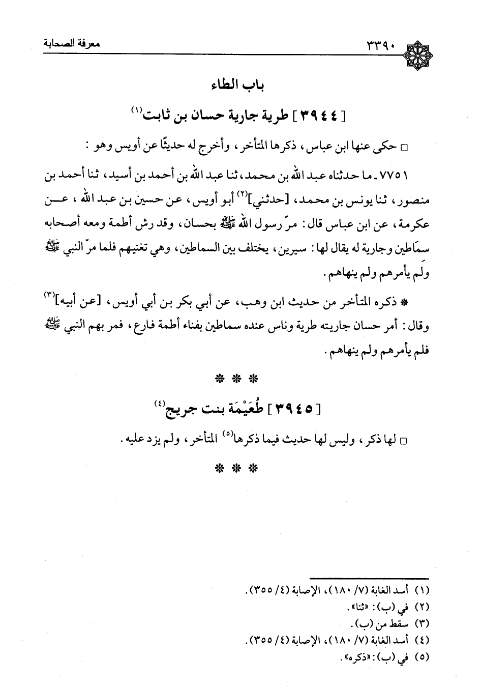 ذَكَرَهُ الْمُتَأَخِّرُ مِنْ حَدِيثِ ابْنِ وَهْبٍ، عَنْ أَبِي بَكْرِ بْنِ أَبِي أُوَيْسٍ، عَنْ أَبِيهِ، وَقَالَ: أَمَرَ حَسَّانُ جَارِيَتَهُ طَرِيَّةَ وَنَاسٌ عِنْدَهُ سِمَاطَيْنِ بِفِنَاءِ أَطَمَةٍ فَارعٍ، فَمَرَّ بِهِمُ النَّبِيُّ صَلَّى اللَّهُ عَلَيْهِ وَسَلَّمَ، فَلَمْ يَأْمُرْهُمْ، وَلَمْ يَنْهَهُمْ "