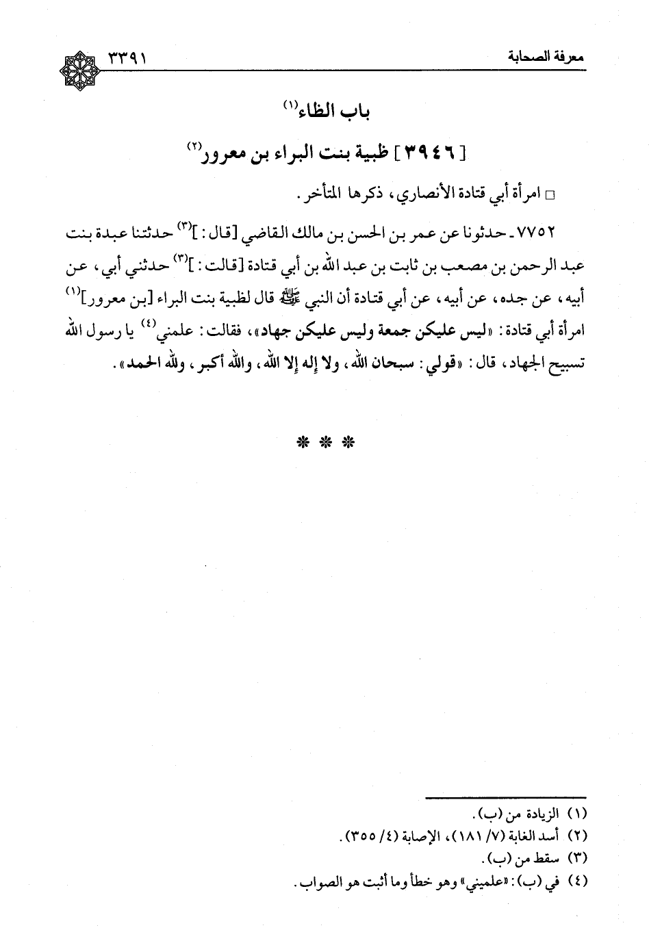 ٧٧٥٢ - حَدَّثُونَا عَنْ عُمَرَ بْنِ الْحَسَنِ بْنِ مَالِكٍ الْقَاضِي، قَالَ: حَدَّثَتْنَا عَبْدَةُ بِنْتُ عَبْدِ الرَّحْمَنِ بْنِ مُصْعَبِ بْنِ ثَابِتِ بْنِ عَبْدِ اللهِ بْنِ أَبِي قَتَادَةَ، قَالَتْ: حَدَّثَنِي أَبِي، عَنْ أَبِيهِ، عَنْ جَدِّهِ، عَنْ أَبِيهِ، عَنْ أَبِي قَتَادَةَ، أَنَّ النَّبِيَّ صَلَّى اللَّهُ عَلَيْهِ وَسَلَّمَ قَالَ لِظَبْيَةَ بِنْتِ الْبَرَاءِ بْنِ مَعْرُورٍ امْرَأَةِ أَبِي قَتَادَةَ: «لَيْسَ عَلَيْكُنَّ جُمُعَةٌ، وَلَيْسَ عَلَيْكُنَّ جِهَادٌ» فَقَالَتْ: عَلِّمْنِي يَا رَسُولَ اللهِ، تَسْبِيحَ الْجِهَادِ، قَالَ: " قُولِي: سُبْحَانَ اللهِ، وَلَا إِلَهَ إِلَّا اللهُ، وَاللهُ أَكْبَرُ، وَلِلَّهِ الْحَمْدُ "
