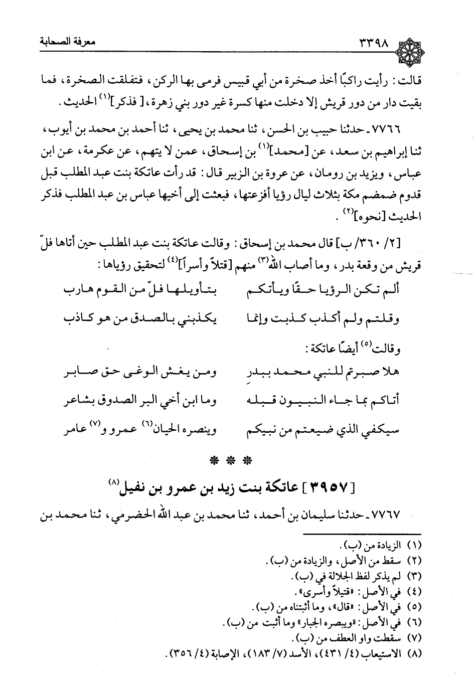 ٧٧٦٦ - قَالَ مُحَمَّدُ بْنُ إِسْحَاقَ: وَقَالَتْ عَاتِكَةُ بِنْتُ عَبْدِ الْمُطَّلِبِ حِينَ أَتَاهَا فَلُّ قُرَيْشٍ مِنْ وَقْعَةِ بَدْرٍ، وَمَا أَصَابَ اللهُ مِنْهُمْ قَتْلًا وَأَسْرًا لِتَحْقِيقِ رُؤْيَاهَا: