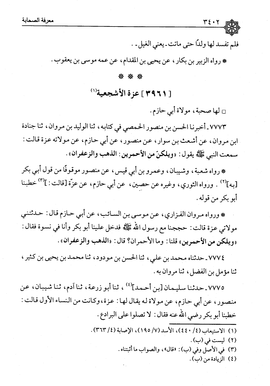 ٧٧٧٣ - وَرَوَاهُ مَرْوَانُ الْفَزَارِيُّ، عَنْ مُوسَى بْنِ السَّائِبِ، عَنْ أَبِي حَازِمٍ، قَالَ: حَدَّثَتْنِي مَوْلَاتِي عَزَّةُ، قَالَتْ: حَجَجْنَا مَعَ رَسُولِ اللهِ صَلَّى اللَّهُ عَلَيْهِ وَسَلَّمَ فَدَخَلَ عَلَيْنَا أَبُو بَكْرٍ وَأَنَا فِي نِسْوَةٍ، فَقَالَ: «وَيْلَكُنَّ مِنَ الْأَحْمَرَيْنِ» قُلْنَا: وَمَا الْأَحْمَرَانِ؟ قَالَ: «الذَّهَبُ وَالزَّعْفَرَانُ»