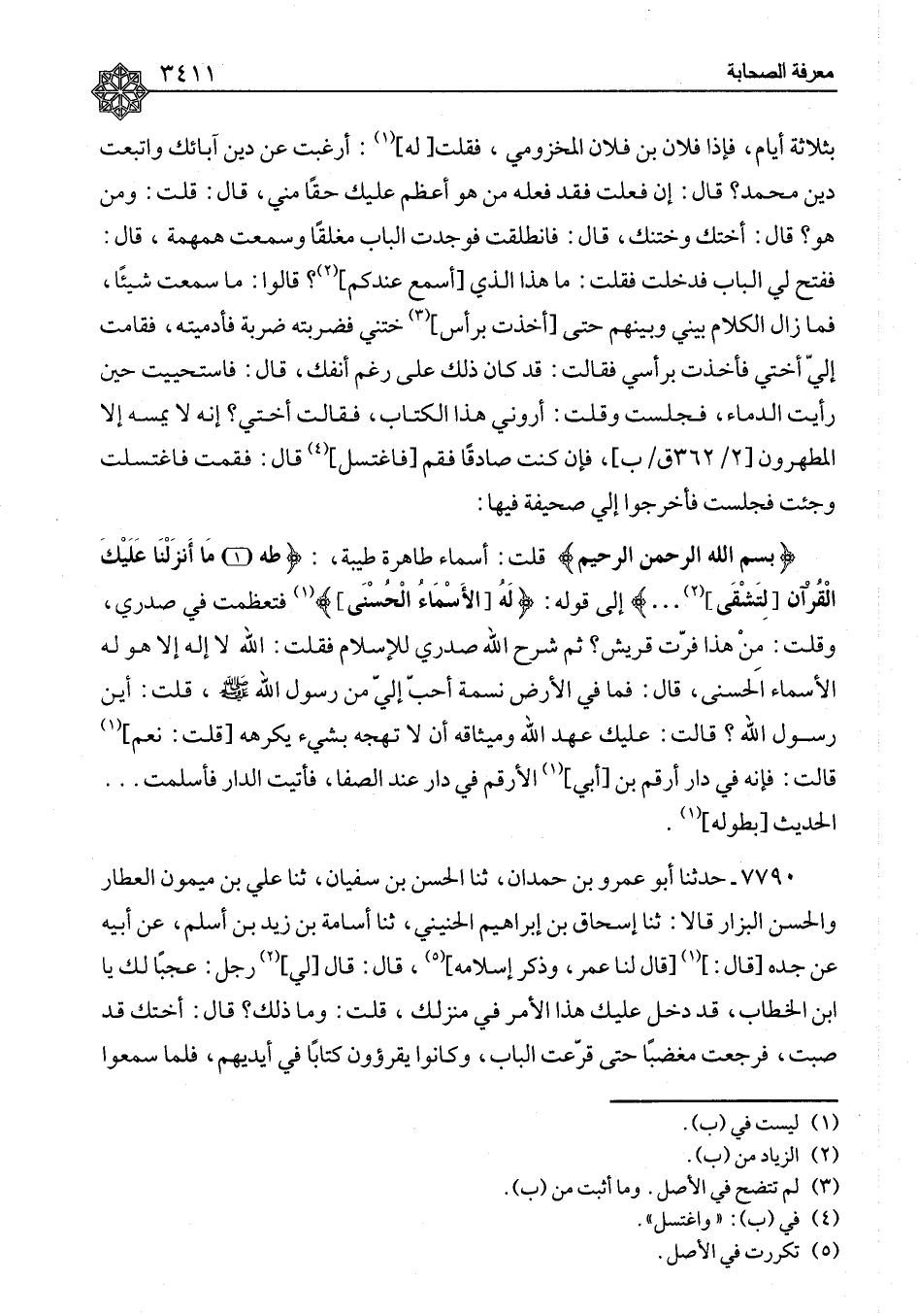 ٧٧٩٠ - حَدَّثَنَا أَبُو عَمْرِو بْنُ حَمْدَانَ، ثنا الْحَسَنُ بْنُ سُفْيَانَ، ثنا عَلِيُّ بْنُ مَيْمُونٍ الْعَطَّارُ، وَالْحَسَنُ الْبَزَّارُ، قَالَا: حَدَّثَنَا إِسْحَاقُ بْنُ إِبْرَاهِيمَ الْحُنَيْنِيُّ، ثنا أُسَامَةُ بْنُ زَيْدِ بْنِ أَسْلَمَ، عَنْ أَبِيهِ، عَنْ جَدِّهِ، قَالَ: قَالَ لَنَا عُمَرُ، وَذَكَرَ إِسْلَامَهُ، قَالَ: " قَالَ لِي رَجُلٌ: عَجَبًا لَكَ يَا ابْنَ الْخَطَّابِ، قَدْ دَخَلَ عَلَيْكَ هَذَا الْأَمْرُ فِي مَنْزِلِكَ، قُلْتُ: وَمَا ذَلِكَ؟ قَالَ: أُخْتُكَ قَدْ صَبَأَتْ، فَرَجَعْتُ مُغْضَبًا حَتَّى قَرَعْتُ الْبَابَ، وَكَانُوا يَقْرَءُونَ كِتَابًا فِي أَيْدِيهِمْ، فَلَمَّا سَمِعُوا ⦗٣٤١٢⦘ صَوْتِي، قَامُوا حَتَّى اخْتَبَئُوا فِي مَكَانٍ وَتَرَكُوا الْكِتَابَ عَلَى حَالِهِ، فَلَمَّا فَتَحَتْ لِي أُخْتِي قُلْتُ: يَا عَدُوَّةَ نَفْسِهَا أَصَبَوْتِ؟ فَأَرْفَعُ شَيْئًا فِي يَدِي فَأَضْرِبُ بِهِ رَأْسَهَا، فَابْتَدَرَ الدَّمُ فَسَالَ عَلَى رَأْسِهَا، فَبَكَتْ، وَقَالَتْ: يَا ابْنَ الْخَطَّابِ، مَا كُنْتَ صَانِعًا فَاصْنَعْهُ فَقَدْ أَسْلَمْتُ، فَجَلَسْتُ عَلَى السَّرِيرِ، فَإِذَا صَحِيفَةٌ وَسَطَ الْبَيْتِ، فَقُلْتُ: مَا هَذِهِ الصَّحِيفَةُ هَاهُنَا؟ قَالَ: دَعْنَا عَنْكَ يَا ابْنَ الْخَطَّابِ، إِنَّكَ لَا تَغْتَسِلُ مِنَ الْجَنَابَةِ وَلَا تَطْهُرُ، وَهَذَا لَا يَمَسُّهُ إِلَّا الْمُطَهَّرُونَ، وَذَكَرَ إِسْلَامَهُ "