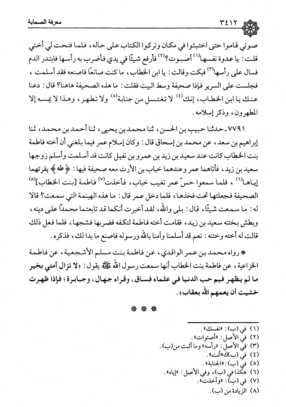 ٧٧٩١ - حَدَّثَنَا حَبِيبُ بْنُ الْحَسَنِ، ثنا مُحَمَّدُ بْنُ يَحْيَى، ثنا أَحْمَدُ بْنُ مُحَمَّدٍ، ثنا إِبْرَاهِيمُ بْنُ سَعْدٍ، عَنْ مُحَمَّدِ بْنِ إِسْحَاقَ، قَالَ: " وَكَانَ إِسْلَامُ عُمَرَ فِيمَا بَلَغَنِي أَنَّ أُخْتَهُ فَاطِمَةَ بِنْتَ الْخَطَّابِ كَانَتْ عِنْدَ سَعِيدِ بْنِ زَيْدِ بْنِ عَمْرِو بْنِ نُفَيْلٍ، كَانَتْ قَدْ أَسْلَمَتْ وَأَسْلَمَ زَوْجُهَا سَعِيدُ بْنُ زَيْدٍ، فَأَتَاهُمَا عُمَرُ وَعِنْدَهُمَا خَبَّابُ بْنُ الْأَرَتِّ مَعَهُ صَحِيفَةٌ، فِيهَا: {طَهَ} [طه: ١] يُقْرِئُهُمَا إِيَّاهَا، فَلَمَّا سَمِعُوا حِسَّ عُمَرَ تَغَيَّبَ خَبَّابٌ، فَأَخَذَتْ فَاطِمَةُ بِنْتُ الْخَطَّابِ الصَّحِيفَةَ، فَجَعَلَتْهَا تَحْتَ فَخِذِهَا، فَلَمَّا دَخَلَ عُمَرُ، قَالَ: مَا هَذِهِ الْهَيْنَمَةُ الَّتِي سَمِعْتُ؟ قَالَا لَهُ: مَا سَمِعْتَ شَيْئًا، قَالَ: بَلَى، وَاللهِ، لَقَدْ أُخْبِرْتُ أَنَّكُمَا قَدْ تَابَعْتُمَا مُحَمَّدًا عَلَى دِينِهِ، وَبَطَشَ بِخَتَنِهِ سَعِيدِ بْنِ زَيْدٍ، فَقَامَتْ أُخْتُهُ فَاطِمَةُ لِتَكُفَّهُ فَضَرَبَهَا فَشَجَّهَا، فَلَمَّا فَعَلَ ذَلِكَ قَالَتْ لَهُ أُخْتُهُ وَخَتَنُهُ: نَعَمْ قَدْ أَسْلَمْنَا وَآمَنَّا بِاللهِ وَرَسُولِهِ، فَاصْنَعْ مَا بَدَا لَكَ، " فَذَكَرَهُ