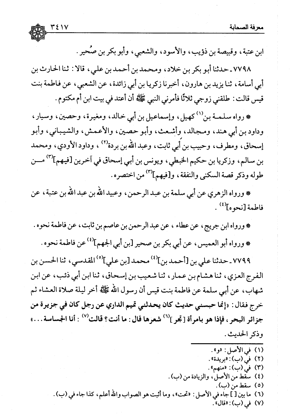 ٧٧٩٩ - حَدَّثَنَا عَلِيُّ بْنُ أَحْمَدَ بْنِ مُحَمَّدِ بْنِ عَلِيٍّ الْمَقْدِسِيُّ، ثنا الْحَسَنُ بْنُ الْفَرَجِ الْعَزِّيُّ، ثنا هِشَامُ بْنُ عَمَّارٍ، ثنا شُعَيْبُ بْنُ إِسْحَاقَ، ثنا ابْنُ أَبِي ذِئْبٍ، عَنِ ابْنِ شِهَابٍ، عَنْ أَبِي سَلَمَةَ، عَنْ فَاطِمَةَ بِنْتِ قَيْسٍ، أَنَّ رَسُولَ اللهِ صَلَّى اللَّهُ عَلَيْهِ وَسَلَّمَ أَخَّرَ لَيْلَةً صَلَاةَ الْعِشَاءِ، ثُمَّ خَرَجَ، فَقَالَ: " إِنَّمَا حَبَسَنِي حَدِيثٌ كَانَ يُحَدِّثُنِي تَمِيمٌ الدَّارِيُّ عَنْ رَجُلٍ كَانَ فِي جَزِيرَةٍ مِنْ جَزَائِرِ الْبَحْرِ، فَإِذَا هُوَ بِامْرَأَةٍ تَجُرُّ شَعْرَهَا، قَالَ: مَا أَنْتِ؟ قَالَتْ: أَنَا الْجَسَّاسَةُ " وَذَكَرَ الْحَدِيثَ ⦗٣٤١٨⦘ رَوَاهُ ابْنُ وَهْبٍ، وَمَعْنٌ وَعَبْدُ اللهِ بْنُ الْحَارِثِ الْمَخْزُومِيُّ، وَعُثْمَانُ بْنُ عُمَرَ فِي جَمَاعَةٍ، عَنِ ابْنِ أَبِي ذِئْبٍ، نَحْوَهُ وَرَوَاهُ إِبْرَاهِيمُ بْنُ إِسْمَاعِيلَ بْنِ مُجَمِّعٍ، عَنِ الزُّهْرِيِّ، عَنْ أَبِي سَلَمَةَ، عَنْ فَاطِمَةَ، نَحْوَهُ وَرَوَاهُ الشَّعْبِيُّ، عَنْ فَاطِمَةَ بِنْتِ قَيْسٍ، قَالَتْ: خَرَجَ عَلَيْنَا رَسُولُ اللهِ صَلَّى اللَّهُ عَلَيْهِ وَسَلَّمَ بِالْهَاجِرَةِ يَوْمًا فَصَعِدَ الْمِنْبَرَ رَوَاهُ عَنْهُ الْعَدَدُ الْكَثِيرُ، وَرَوَاهُ سَلَمَةُ بْنُ صَالِحٍ، عَنْ قَتَادَةَ، عَنِ الشَّعْبِيِّ، عَنْ سُوَيْدِ بْنِ غَفَلَةَ، عَنْ فَاطِمَةَ بِنْتِ قَيْسٍ وَقَدْ ذَكَرْنَاهُ فِي مَوْضِعٍ آخَرَ، وَالزُّهْرِيُّ تَفَرَّدَ عَنْ أَبِي سَلَمَةَ، بِقَوْلِهِ: أَخَّرَ لَيْلَةً صَلَاةَ الْعِشَاءِ، وَلَمْ يَخْتَلِفْ أَصْحَابُ الشَّعْبِيِّ عَنْهُ أَنَّهُ خَرَجَ يَوْمًا بِالْهَاجِرَةِ فَقَعَدَ عَلَى الْمِنْبَرِ