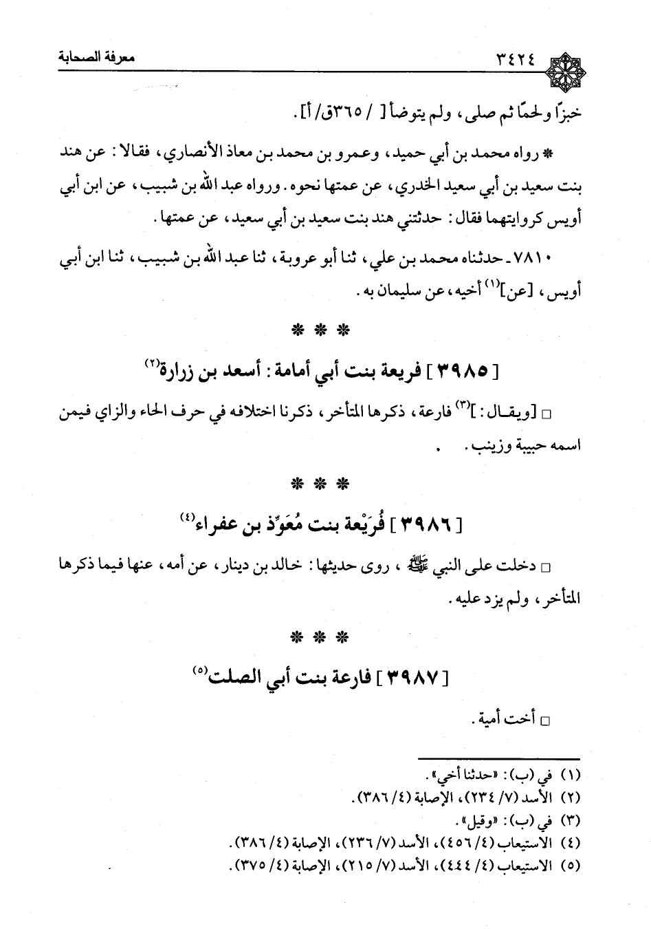 فُرَيْعَةُ بِنْتُ مُعَوِّذِ بْنِ عَفْرَاءَ دَخَلَتْ عَلَى النَّبِيِّ صَلَّى اللَّهُ عَلَيْهِ وَسَلَّمَ، رَوَى حَدِيثَهَا: خَالِدُ بْنُ دِينَارٍ، عَنْ أُمِّهِ، عَنْهَا فِيمَا ذَكَرَهَا الْمُتَأَخِّرُ، وَلَمْ يَزِدْ عَلَيْهِ