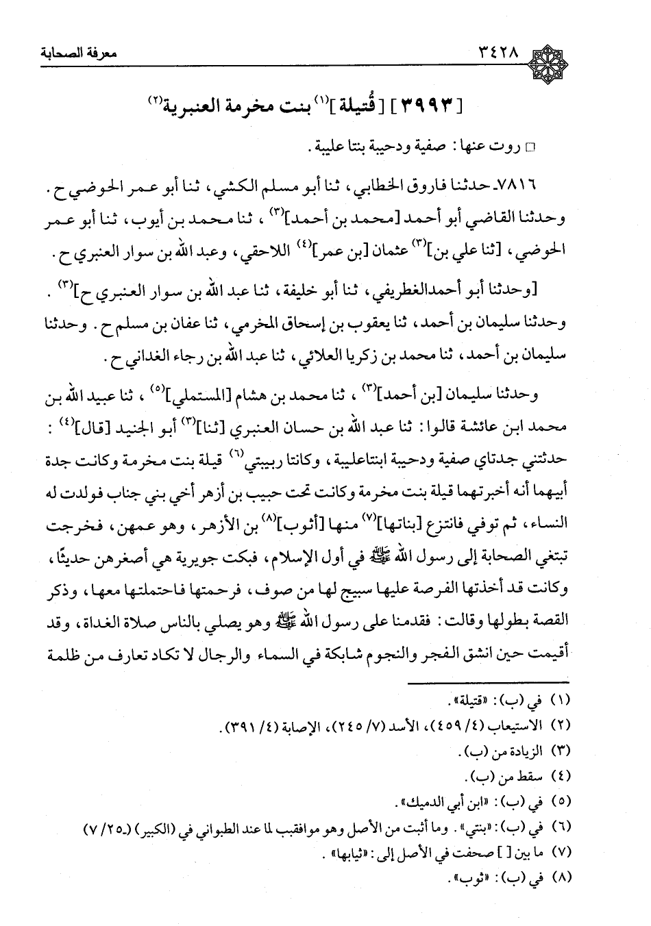 ٧٨١٦ - حَدَّثَنَا فَارُوقٌ الْخَطَّابِيُّ، ثنا أَبُو مُسْلِمٍ الْكَشِّيُّ، ثنا أَبُو عُمَرَ الْحَوْضِيُّ، ح، وَحَدَّثَنَا الْقَاضِي أَبُو أَحْمَدَ مُحَمَّدُ بْنُ أَحْمَدَ، ثنا مُحَمَّدُ بْنُ أَيُّوبَ، ثنا أَبُو عُمَرَ الْحَوْضِيُّ، ثنا عَلِيُّ بْنُ عُثْمَانَ بْنِ عُمَرَ اللَّاحِقِيُّ، وَعَبْدُ اللهِ بْنُ سَوَّارٍ الْعَنْبَرِيُّ، ح، وَحَدَّثَنَا أَبُو أَحْمَدَ الْغِطْرِيفِيُّ، ثنا أَبُو خَلِيفَةَ، ثنا عَبْدُ اللهِ بْنُ سَوَّارٍ الْعَنْبَرِيُّ، ح، وَحَدَّثَنَا سُلَيْمَانُ بْنُ أَحْمَدَ، ثنا يَعْقُوبُ بْنُ إِسْحَاقَ الْمُخَرِّمِيُّ، ثنا عَفَّانُ بْنُ مُسْلِمٍ، ح، وَحَدَّثَنَا سُلَيْمَانُ بْنُ أَحْمَدَ، ثنا مُحَمَّدُ بْنُ زَكَرِيَّا الْعَلَائِيُّ، ثنا عَبْدُ اللهِ بْنُ رَجَاءٍ الْغُدَانِيُّ، ح، وَحَدَّثَنَا سُلَيْمَانُ بْنُ أَحْمَدَ، ثنا مُحَمَّدُ بْنُ هِشَامٍ الْمُسْتَمْلِيُّ، ثنا عُبَيْدُ اللهِ بْنُ مُحَمَّدِ ابْنِ عَائِشَةَ، قَالُوا: ثنا عَبْدُ اللهِ بْنُ حَسَّانَ الْعَنْبَرِيُّ، ثنا أَبُو الْجُنَيْدِ، قَالَ: حَدَّثَتْنِي جَدَّتَاي، صَفِيَّةُ، وَدُحَيْبَةُ ابْنَتَا عُلَيْبَةَ، وَكَانَتَا رَبِيبَتَيْ قَيْلَةَ بِنْتِ مَخْرَمَةَ، وَكَانَتْ جَدَّةَ أَبِيهِمَا، أَنَّهُ أَخْبَرَتْهُمَا قَيْلَةُ بِنْتُ مَخْرَمَةَ، وَكَانَتْ تَحْتَ حَبِيبِ بْنِ أَزْهَرَ أَخِي بَنِي جَنَابٍ فَوَلَدَتْ لَهُ النِّسَاءَ، ثُمَّ تُوُفِّيَ فَانْتَزَعَ بَنَاتِهَا مِنْهَا أَثْوَبُ بْنُ الْأَزْهَرِ، وَهُوَ عَمُّهُنَّ، فَخَرَجَتْ تَبْتَغِي الصَّحَابَةَ إِلَى رَسُولِ اللهِ صَلَّى اللَّهُ عَلَيْهِ وَسَلَّمَ فِي أَوَّلِ الْإِسْلَامِ، فَبَكَتْ جُوَيْرِيَةُ هِيَ أَصْغَرُهُنَّ حَدِيثًا، وَكَانَتْ قَدْ أَخَذَتْهَا الْفُرْصَةُ عَلَيْهَا سَبِيجٌ لَهَا مِنْ صُوفٍ، فَرَحِمَتْهَا فَاحْتَمَلَتْهَا مَعَهَا، وَذَكَرَ الْقِصَّةَ بِطُولِهَا، وَقَالَتْ: فَقَدِمْنَا عَلَى رَسُولِ اللهِ صَلَّى اللَّهُ عَلَيْهِ وَسَلَّمَ وَهُوَ يُصَلِّي بِالنَّاسِ صَلَاةَ الْغَدَاةِ، وَقَدْ أُقِيمَتْ حِينَ انْشَقَّ الْفَجْرُ وَالنُّجُومُ شَابِكَةٌ فِي السَّمَاءِ وَالرِّجَالِ لَا تَكَادُ تَعَارَفَ مِنْ ظُلْمَةِ ⦗٣٤٢٩⦘ اللَّيْلِ، فَسَمِعْتُ رَسُولَ اللهِ صَلَّى اللَّهُ عَلَيْهِ وَسَلَّمَ يَقُولُ: «الْمُسْلِمُ أَخُو الْمُسْلِمِ يَسَعُهُمَا الْمَاءُ وَالشَّجَرُ وَيَتَعَاوَنَانِ عَلَى الْفَتَّانِ»
