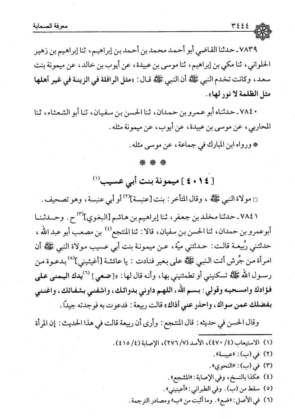 مَيْمُونَةُ بِنْتُ أَبِي عَسِيبٍ مَوْلَاةُ النَّبِيِّ صَلَّى اللَّهُ عَلَيْهِ وَسَلَّمَ، وَقَالَ الْمُتَأَخِّرُ: بِنْتُ عَنْبَسَةَ، أَوْ أَبِي عَنْبَسَةَ، وَهُوَ تَصْحِيفٌ