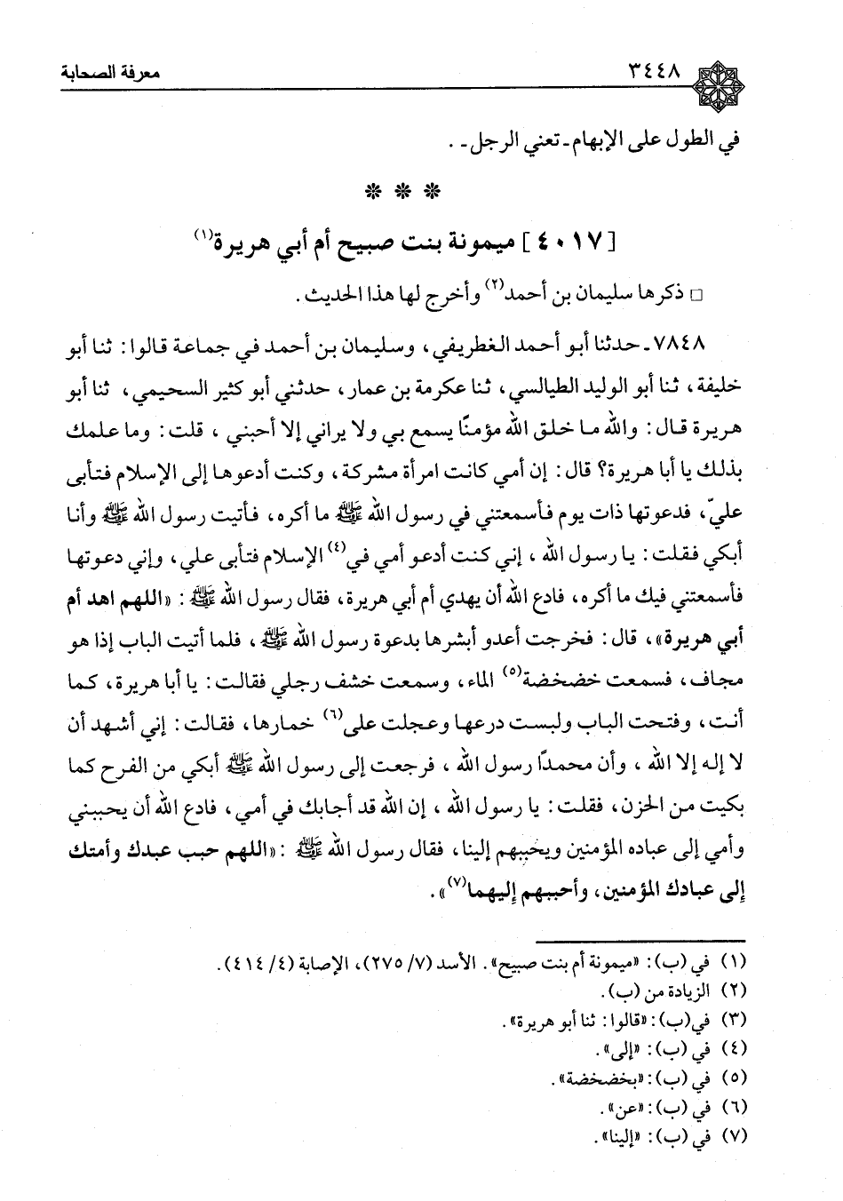 ٧٨٤٨ - حَدَّثَنَا أَبُو أَحْمَدَ الْغِطْرِيفِيُّ، وَسُلَيْمَانُ بْنُ أَحْمَدَ، فِي جَمَاعَةٍ قَالُوا: ثنا أَبُو خَلِيفَةَ، ثنا أَبُو الْوَلِيدِ الطَّيَالِسِيُّ، ثنا عِكْرِمَةُ بْنُ عَمَّارٍ، حَدَّثَنِي أَبُو كَثِيرٍ السُّحَيْمِيُّ، ثنا أَبُو هُرَيْرَةَ، قَالَ: وَاللهِ مَا خَلَقَ اللهُ مُؤْمِنًا يَسْمَعُ بِي، وَلَا يَرَانِي إِلَّا أَحَبَّنِي، قُلْتُ: وَمَا عِلْمُكَ بِذَلِكَ يَا أَبَا هُرَيْرَةَ؟ قَالَ: إِنَّ أُمِّي كَانَتِ امْرَأَةً مُشْرِكَةً، وَكُنْتُ أَدْعُوهَا إِلَى الْإِسْلَامِ فَتَأْبَى عَلَيَّ، فَدَعَوْتُهَا ذَاتَ يَوْمٍ فَأَسْمَعَتْنِي فِي رَسُولِ اللهِ صَلَّى اللَّهُ عَلَيْهِ وَسَلَّمَ مَا أَكْرَهُ، فَأَتَيْتُ رَسُولَ اللهِ صَلَّى اللَّهُ عَلَيْهِ وَسَلَّمَ وَأَنَا أَبْكِي، فَقُلْتُ: يَا رَسُولَ اللهِ، إِنِّي كُنْتُ أَدْعُو أُمِّي فِي الْإِسْلَامِ فَتَأْبَى عَلَيَّ، وَإِنِّي دَعَوْتُهَا فَأَسْمَعَتْنِي فِيكَ مَا أَكْرَهُ، فَادْعُ اللهَ أَنْ يَهْدِيَ أُمَّ أَبِي هُرَيْرَةَ، فَقَالَ رَسُولُ اللهِ صَلَّى اللَّهُ عَلَيْهِ وَسَلَّمَ: «اللهُمَّ اهْدِ أُمَّ أَبِي هُرَيْرَةَ» قَالَ: فَخَرَجْتُ أَعْدُو أُبَشِّرُهَا بِدَعْوَةِ رَسُولِ اللهِ صَلَّى اللَّهُ عَلَيْهِ وَسَلَّمَ، فَلَمَّا أَتَيْتُ الْبَابَ إِذَا هُوَ مُجَافٌ، فَسَمِعْتُ خَضْخَضَةَ الْمَاءِ، وَسَمِعَتْ خِشْفَ رِجْلَيَّ، فَقَالَتْ: يَا أَبَا هُرَيْرَةَ، كَمَا أَنْتَ، وَفَتَحَتِ الْبَابَ وَلَبِسَتْ دِرْعَهَا، وَعَجِلَتْ عَلَى خِمَارِهَا، فَقَالَتْ: إِنِّي أَشْهَدُ أَنْ لَا إِلَهَ إِلَّا اللهُ، وَأَنَّ مُحَمَّدًا رَسُولُ اللهِ، فَرَجَعْتُ إِلَى رَسُولِ اللهِ صَلَّى اللَّهُ عَلَيْهِ وَسَلَّمَ أَبْكِي مِنَ الْفَرَحِ كَمَا بَكَيْتُ مِنَ الْحُزْنِ، فَقُلْتُ: يَا رَسُولَ اللهِ، إِنَّ اللهَ قَدْ أَجَابَكَ فِي أُمِّي، فَادْعُ اللهَ أَنْ يُحَبِّبَنِي وَأُمِّي إِلَى عِبَادِهِ الْمُؤْمِنِينَ وَيُحَبِّبَهُمْ إِلَيْنَا، فَقَالَ رَسُولُ اللهِ صَلَّى اللَّهُ عَلَيْهِ وَسَلَّمَ: «اللهُمَّ حَبِّبْ عَبْدَكَ وَأَمَتَكَ إِلَى عِبَادِكَ الْمُؤْمِنِينَ، وَأَحبِبْهُمْ إِلَيْهِمَا» ⦗٣٤٤٩⦘ رَوَاهُ النَّضْرُ بْنُ شُمَيْلٍ، وَعُمَرُ بْنُ يُونُسَ الْيَمَامِيُّ، عَنْ عِكْرِمَةَ بْنِ عَمَّارٍ، مِثْلَهُ