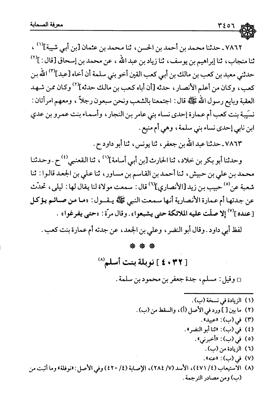٧٨٦٢ - حَدَّثَنَا مُحَمَّدُ بْنُ أَحْمَدَ بْنِ الْحَسَنِ، ثنا مُحَمَّدُ بْنُ عُثْمَانَ بْنِ أَبِي شَيْبَةَ، ثنا مِنْجَابٌ، ثنا إِبْرَاهِيمُ بْنُ يُوسُفَ، ثنا زِيَادُ بْنُ عَبْدِ اللهِ، عَنْ مُحَمَّدِ بْنِ إِسْحَاقَ، قَالَ: حَدَّثَنِي مَعْبَدُ بْنُ كَعْبِ بْنِ مَالِكِ بْنِ أَبِي كَعْبٍ الْقَيْنِ، أَخُو بَنِي سَلَمَةَ، أَنَّ أَخَاهَ عَبْدَ اللهِ بْنَ كَعْبٍ، وَكَانَ مِنْ أَعْلَمِ الْأَنْصَارِ، حَدَّثَهُ أَنَّ أَبَاهُ كَعْبَ بْنَ مَالِكٍ حَدَّثَهُ، وَكَانَ مِمَّنْ شَهِدَ الْعَقَبَةَ، وَبَايَعَ رَسُولَ اللهِ صَلَّى اللَّهُ عَلَيْهِ وَسَلَّمَ، قَالَ: " اجْتَمَعْنَا بِالشِّعْبِ وَنَحْنُ سَبْعُونَ رَجُلًا، وَمَعَهُمُ امْرَأَتَانِ: نُسَيْبَةُ بِنْتُ كَعْبٍ أُمُّ عُمَارَةَ إِحْدَى نِسَاءِ بَنِي عَامِرِ بْنِ النَّجَّارِ، وَأَسْمَاءُ بِنْتُ عَمْرِو بْنِ عَدِيِّ بْنِ نَابِي إِحْدَى نِسَاءِ بَنِي سَلَمَةَ، وَهِيَ أُمُّ مَنِيعٍ "