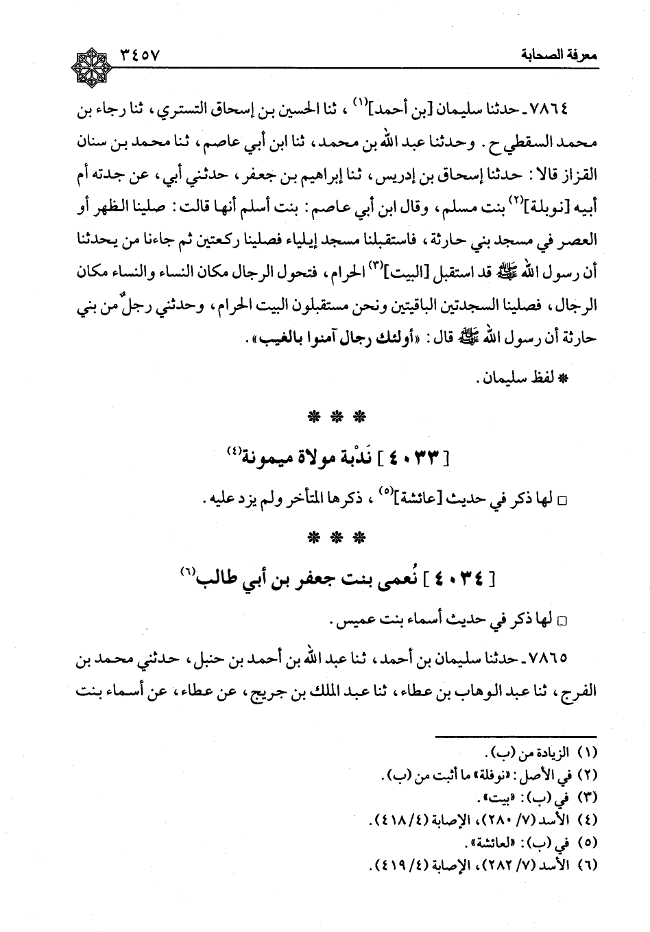 ٧٨٦٤ - حَدَّثَنَا سُلَيْمَانُ بْنُ أَحْمَدَ، ثنا الْحُسَيْنُ بْنُ إِسْحَاقَ التُّسْتَرِيُّ، ثنا رَجَاءُ بْنُ مُحَمَّدٍ السَّقَطِيُّ، ح وَحَدَّثَنَا عَبْدُ اللهِ بْنُ مُحَمَّدٍ، ثنا ابْنُ أَبِي عَاصِمٍ، ثنا مُحَمَّدُ بْنُ سِنَانٍ الْقَزَّازُ، قَالَا: حَدَّثَنَا إِسْحَاقُ بْنُ إِدْرِيسَ، ثنا إِبْرَاهِيمُ بْنُ جَعْفَرٍ، حَدَّثَنِي أَبِي، عَنْ جَدَّتِهِ أُمِّ أَبِيهِ نَوْبَلَةَ بِنْتِ مُسْلِمٍ، وَقَالَ ابْنُ أَبِي عَاصِمٍ: بِنْتِ أَسْلَمَ، أَنَّهَا قَالَتْ: صَلَّيْتُ الظُّهْرَ أَوِ الْعَصْرَ فِي مَسْجِدِ بَنِي حَارِثَةَ، فَاسْتَقْبَلْنَا مَسْجِدَ إِيلِيَاءَ، فَصَلَّيْنَا رَكْعَتَيْنِ، ثُمَّ جَاءَنَا مَنْ يُحَدِّثُنَا أَنَّ رَسُولَ اللهِ صَلَّى اللَّهُ عَلَيْهِ وَسَلَّمَ قَدِ اسْتَقْبَلَ الْبَيْتَ الْحَرَامَ، فَتَحَوَّلَ الرِّجَالُ مَكَانَ النِّسَاءِ، وَالنِّسَاءُ مَكَانَ الرِّجَالِ، فَصَلَّيْنَا السَّجْدَتَيْنِ الْبَاقِيَتَيْنِ وَنَحْنُ مُسْتَقْبِلُونَ الْبَيْتَ الْحَرَامَ، وَحَدَّثَنِي رَجُلٌ مِنْ بَنِي حَارِثَةَ، أَنَّ رَسُولَ اللهِ صَلَّى اللَّهُ عَلَيْهِ وَسَلَّمَ، قَالَ: «أُولَئِكَ رِجَالٌ آمَنُوا بِالْغَيْبِ» لَفْظُ سُلَيْمَانَ