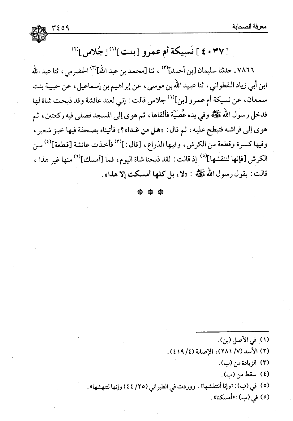 ٧٨٦٦ - حَدَّثَنَا سُلَيْمَانُ بْنُ أَحْمَدَ، ثنا مُحَمَّدُ بْنُ عَبْدِ اللهِ الْحَضْرَمِيُّ، ثنا عَبْدُ اللهِ بْنُ أَبِي زِيَادٍ الْقَطَوَانِيُّ، ثنا عُبَيْدُ اللهِ بْنُ مُوسَى، عَنْ إِبْرَاهِيمَ بْنِ إِسْمَاعِيلَ، عَنْ حَبِيبَةَ بِنْتِ سَمْعَانَ، عَنْ نَسِيكَةَ أُمِّ عَمْرِو بْنِ جُلَاسٍ، قَالَتْ: إِنِّي لَعِنْدَ عَائِشَةَ وَقَدْ ذَبَحَتْ شَاةً لَهَا، فَدَخَلَ رَسُولُ اللهِ صَلَّى اللَّهُ عَلَيْهِ وَسَلَّمَ وَفِي يَدِهِ عُصَيَّةٌ فَأَلْقَاهَا، ثُمَّ هَوَى إِلَى الْمَسْجِدِ فَصَلَّى فِيهِ رَكْعَتَيْنِ، ثُمَّ هَوَى إِلَى فِرَاشِهِ، فَتَبَطَّحَ عَلَيْهِ، ثُمَّ قَالَ: «هَلْ مِنْ غَدَاءٍ؟» فَأَتَيْنَاهُ بِصَحْفَةٍ فِيهَا خُبْزُ شَعِيرٍ، وَفِيهَا كِسْرَةٌ وَقَطْعَةٌ مِنَ الْكَرِشِ، وَفِيهَا الذِّرَاعُ، قَالَ: فَأَخَذَتْ عَائِشَةُ قِطْعَةً مِنَ الْكَرِشِ فَإِنَّهَا لَتَنْقُشُهَا، إِذْ قَالَتْ: لَقَدْ ذَبَحْنَا شَاةً الْيَوْمَ، فَمَا أُمْسِكُ مِنْهَا غَيْرَ هَذَا، قَالَتْ: يَقُولُ رَسُولُ اللهِ صَلَّى اللَّهُ عَلَيْهِ وَسَلَّمَ: «لَا، بَلْ كُلَّهَا أَمْسَكْتِ إِلَّا هَذَا»