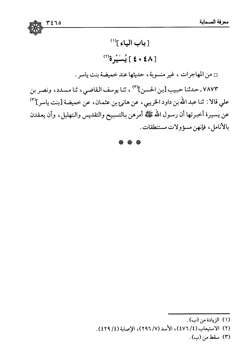 ٧٨٧٣ - حَدَّثَنَا حَبِيبُ بْنُ الْحَسَنِ، ثنا يُوسُفُ الْقَاضِي، ثنا مُسَدَّدٌ، وَنَصْرُ بْنُ عَلِيٍّ، قَالَا: ثنا عَبْدُ اللهِ بْنُ دَاوُدَ الْخُرَيْبِيُّ، عَنْ هَانِئِ بْنِ عُثْمَانَ، عَنْ خُمَيْضَةَ بِنْتِ يَاسِرٍ، عَنْ يُسَيْرَةَ، أَخْبَرَتْهَا أَنَّ رَسُولَ اللهِ صَلَّى اللَّهُ عَلَيْهِ وَسَلَّمَ «أَمَرَهُنَّ بِالتَّسْبِيحِ وَالتَّقْدِيسِ وَالتَّهْلِيلِ، وَأَنْ يَعْقِدْنَ بِالْأَنَامِلِ، فَإِنَّهُنَّ مَسْؤُولَاتٌ مُسْتَنْطَقَاتٌ»