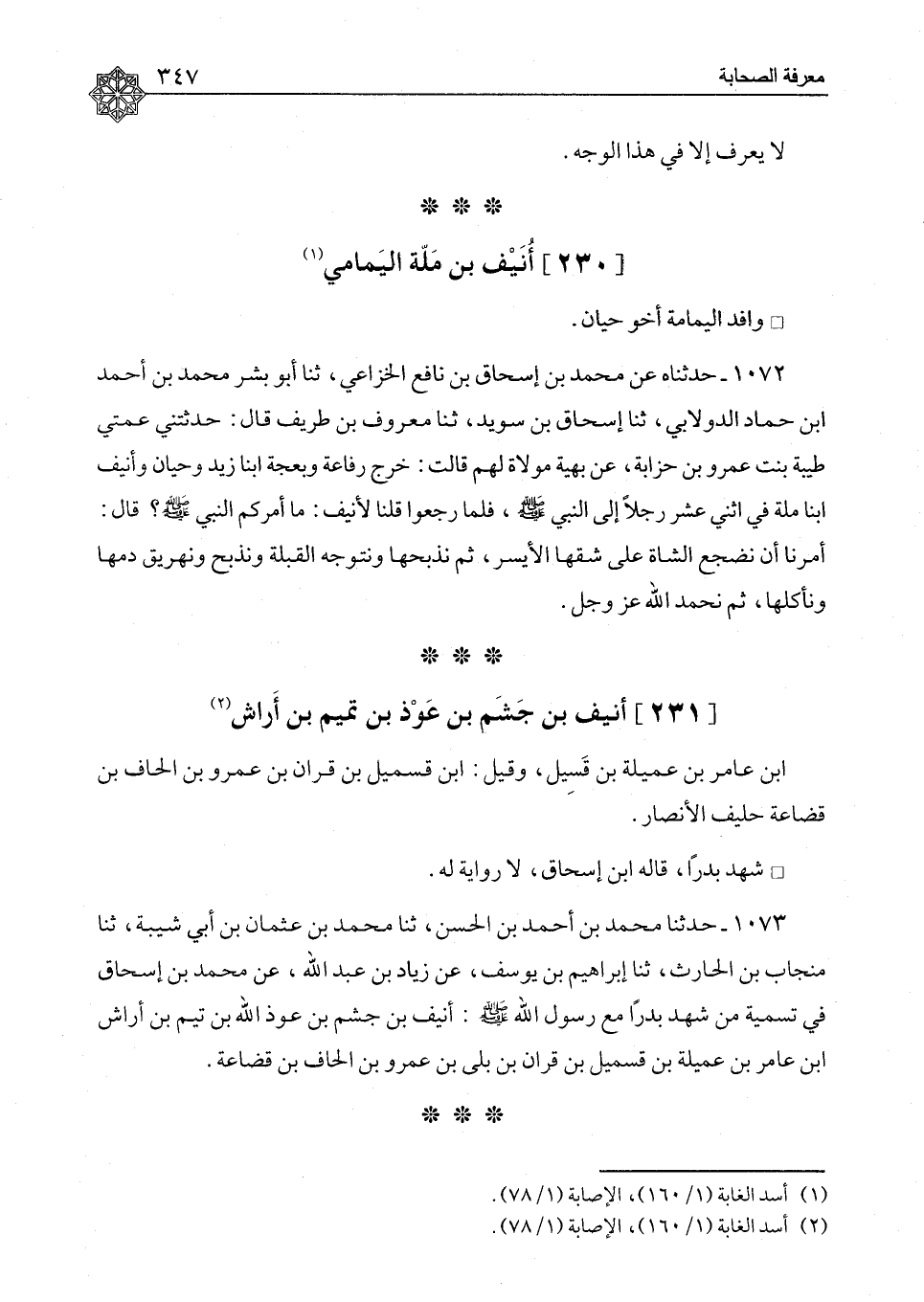 ١٠٧٣ - حَدَّثَنَا مُحَمَّدُ بْنُ أَحْمَدَ بْنِ الْحَسَنِ، ثنا مُحَمَّدُ بْنُ عُثْمَانَ بْنِ أَبِي شَيْبَةَ، ثنا مِنْجَابُ بْنُ الْحَارِثِ، ثنا إِبْرَاهِيمُ بْنُ يُوسُفَ، عَنْ زِيَادِ بْنِ عَبْدِ اللهِ، عَنْ مُحَمَّدِ بْنِ إِسْحَاقَ، " فِي تَسْمِيَةِ مَنْ شَهِدَ بَدْرًا مَعَ رَسُولِ اللهِ صَلَّى اللَّهُ عَلَيْهِ وَسَلَّمَ: أُنَيْفُ بْنُ جُشَمَ بْنِ عَوْذِ اللهِ بْنِ تَيْمِ بْنِ أَرَاشِ بْنِ عَامِرِ بْنِ عَمِيلَةَ بْنِ قَسْمِيلِ بْنِ قُرَّانَ بْنِ بَلِيِّ بْنِ عَمْرِو بْنِ الْحَافِ بْنِ قُضَاعَةَ "