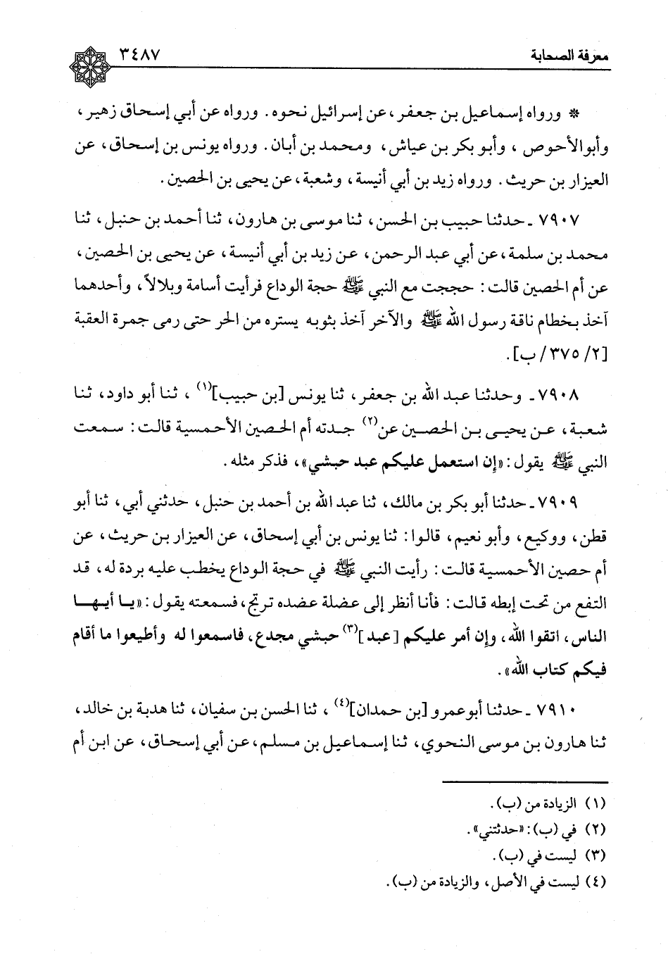 ٧٩٠٧ - حَدَّثَنَا حَبِيبُ بْنُ الْحَسَنِ، ثنا مُوسَى بْنُ هَارُونَ، ثنا أَحْمَدُ بْنُ حَنْبَلٍ، ثنا مُحَمَّدُ بْنُ سَلَمَةَ، عَنْ أَبِي عَبْدِ الرَّحْمَنِ، عَنْ زَيْدِ بْنِ أَبِي أُنَيْسَةَ، عَنْ يَحْيَى بْنِ الْحُصَيْنِ، عَنْ أُمِّ الْحُصَيْنِ، قَالَتْ: " حَجَجْتُ مَعَ النَّبِيِّ صَلَّى اللَّهُ عَلَيْهِ وَسَلَّمَ حِجَّةَ الْوَدَاعِ، فَرَأَيْتُ أُسَامَةَ وَبِلَالًا، وَأَحَدُهُمَا آخِذٌ بِخِطَامِ نَاقَةِ رَسُولِ اللهِ صَلَّى اللَّهُ عَلَيْهِ وَسَلَّمَ، وَالْآخَرُ آخِذٌ بِثَوْبِهِ يَسْتُرُهُ مِنَ الْحَرِّ حَتَّى رَمَى جَمْرَةَ الْعَقَبَةِ