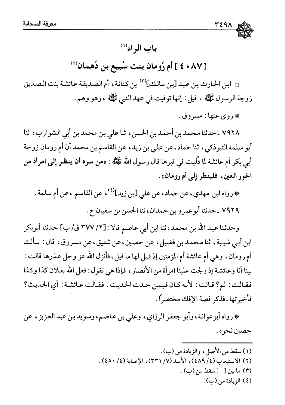 ٧٩٢٨ - حَدَّثَنَا مُحَمَّدُ بْنُ أَحْمَدَ بْنِ الْحَسَنِ، ثنا عَلِيُّ بْنُ مُحَمَّدِ بْنِ أَبِي الشَّوَارِبِ، ثنا أَبُو سَلَمَةَ التَّبُوذَكِيُّ، ثنا حَمَّادٌ، عَنْ عَلِيِّ بْنِ زَيْدٍ، عَنِ الْقَاسِمِ بْنِ مُحَمَّدٍ، أَنَّ أُمَّ رُومَانَ، زَوْجَةَ أَبِي بَكْرٍ أُمَّ عَائِشَةَ لَمَّا دُلِّيَتْ فِي قَبْرِهَا قَالَ رَسُولُ اللهِ صَلَّى اللَّهُ عَلَيْهِ وَسَلَّمَ: «مَنْ سَرَّهُ أَنْ يَنْظُرَ إِلَى امْرَأَةٍ مِنَ الْحُورِ الْعِينِ، فَلْيَنْظُرْ إِلَى أُمِّ رُومَانَ» رَوَاهُ ابْنُ مَهْدِيٍّ، عَنْ حَمَّادٍ، عَنْ عَلِيِّ بْنِ زَيْدٍ، عَنِ الْقَاسِمِ، عَنْ أُمِّ سَلَمَةَ