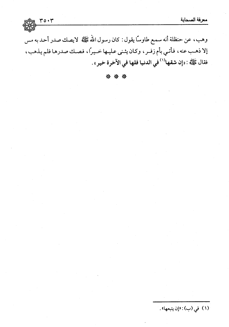 عَنْ حَنْظَلَةَ، أَنَّهُ سَمِعَ طَاوُسًا يَقُولُ: كَانَ رَسُولُ اللهِ صَلَّى اللَّهُ عَلَيْهِ وَسَلَّمَ لَا يَصُكُّ صَدْرَ أَحَدٍ بِهِ مَسٌّ إِلَّا ذَهَبَ عَنْهُ، فَأُتِيَ بِأُمِّ زُفَرَ، وَكَانَ يُثْنِي عَلَيْهَا خَيْرًا، فَصَكَّ صَدْرَهَا فَلَمْ يَذْهَبْ، فَقَالَ صَلَّى اللَّهُ عَلَيْهِ وَسَلَّمَ: «إِنْ شَقَّهَا فِي الدُّنْيَا فَلَهَا فِي الْآخِرَةِ خَيْرٌ»