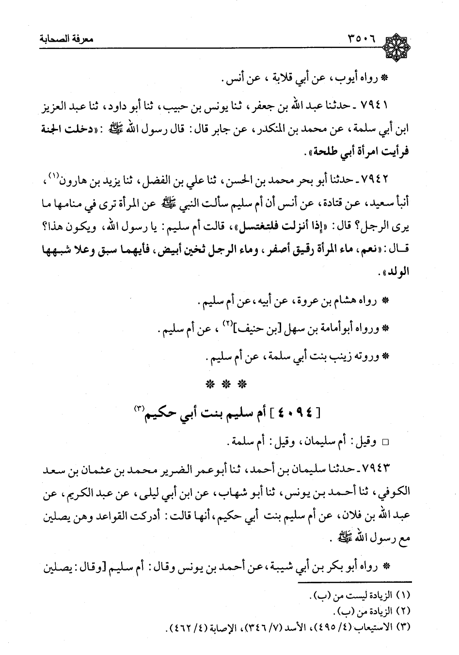٧٩٤٢ - حَدَّثَنَا أَبُو بَحْرٍ مُحَمَّدُ بْنُ الْحَسَنِ، ثنا عَلِيُّ بْنُ الْفَضْلِ، ثنا يَزِيدُ بْنُ هَارُونَ، أَنْبَأَ سَعِيدٌ، عَنْ قَتَادَةَ، عَنْ أَنَسٍ، أَنَّ أُمَّ سُلَيْمٍ، سَأَلَتِ النَّبِيَّ صَلَّى اللَّهُ عَلَيْهِ وَسَلَّمَ عَنِ الْمَرْأَةِ تَرَى فِي مَنَامِهَا مَا يَرَى الرَّجُلُ؟ قَالَ: «إِذَا أَنْزَلَتْ فَلْتَغْتَسِلْ» قَالَتْ أُمُّ سُلَيْمٍ: يَا رَسُولَ اللهِ، وَيَكُونُ هَذَا؟ قَالَ: «نَعَمْ، مَاءُ الْمَرْأَةِ رَقِيقٌ أَصْفَرُ، وَمَاءُ الرَّجُلِ ثَخِينٌ أَبْيَضُ، فَأَيُّهُمَا سَبَقَ وَعَلَا شَبِهَهَا الْوَلَدُ» رَوَاهُ هِشَامُ بْنُ عُرْوَةَ، عَنْ أَبِيهِ، عَنْ أُمِّ سُلَيْمٍ وَرَوَاهُ أَبُو أُمَامَةَ بْنُ سَهْلِ بْنِ حُنَيْفٍ، عَنْ أُمِّ سُلَيْمٍ وَرَوَتْهُ زَيْنَبُ بِنْتُ أَبِي سَلَمَةَ، عَنْ أُمِّ سُلَيْمٍ